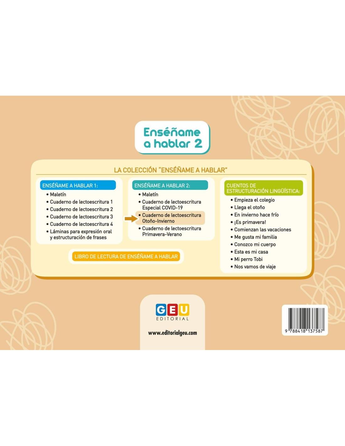Este cuaderno de lectoescritura infantil constituye un repaso del material Enséñame a hablar 2.Una herramienta útil para el afianzamiento del vocabulario, dando la posibilidad al niño de crear frases bien construidas y de adquirir un vocabulario rico y estructurado.