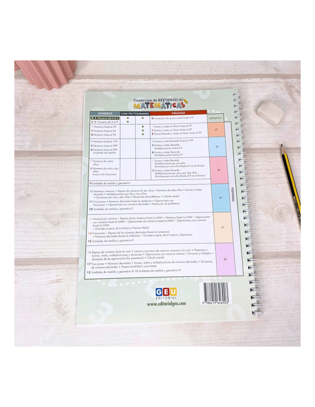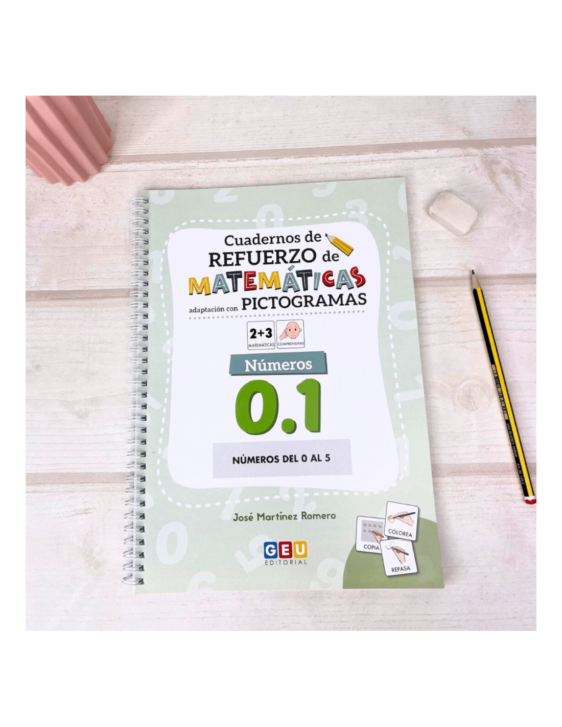 Este Cuaderno de Refuerzo de Matemáticas adaptado con PICTOGRAMAS, de Editorial GEU, está diseñado especialmente para TEA y alumnos con NEE, utilizando apoyos visuales para facilitar el aprendizaje.