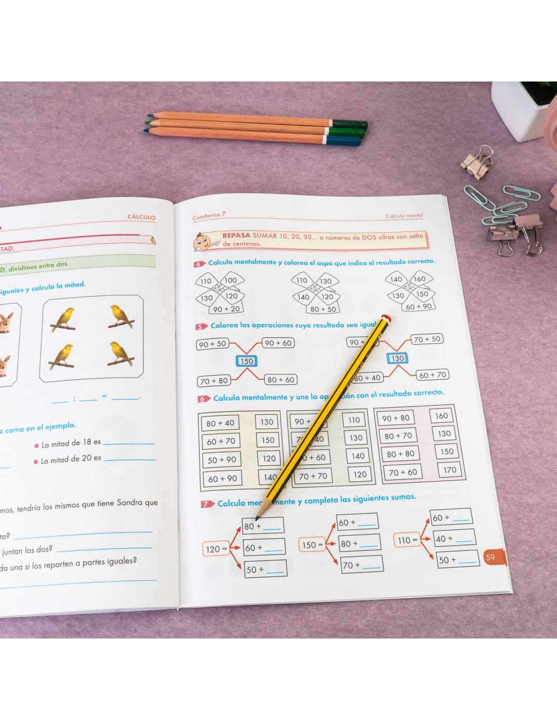 Cuaderno de Matemáticas Comprensivas Cálculo 7: Un cuaderno completo que trabaja las sumas y restas llevando, la multiplicación por una cifra y las divisiones por una cifra (hasta el número 5 como divisor). Las actividades progresivas desarrollan el razonamiento lógico y refuerzan la confianza al enfrentarse a operaciones más complejas.