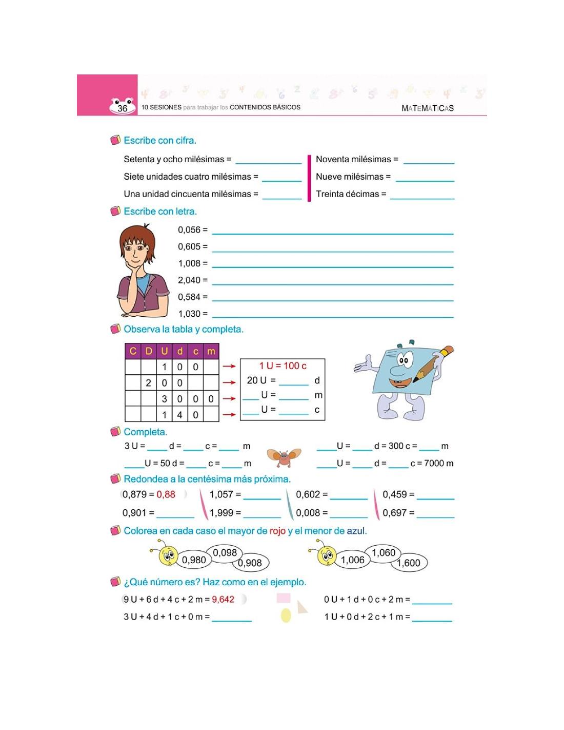 - Matemáticas: números naturales y decimales, operaciones con números naturales y decimales, problemas, fracciones, geometría y unidades de medida.