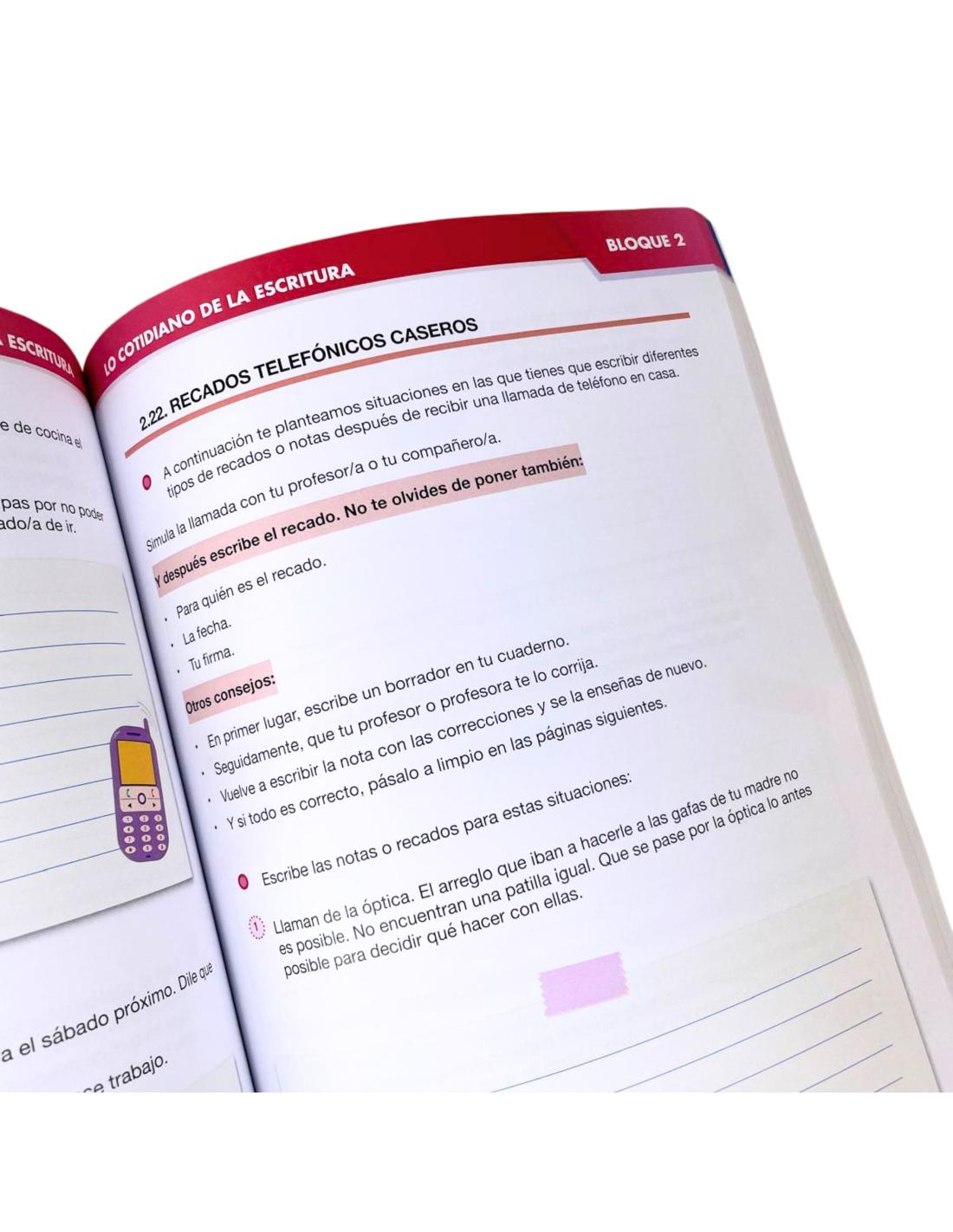El segundo bloque, “Lo cotidiano de la escritura: ¿para qué necesito la escritura en mi día a día?”, enseña la utilidad de la escritura en situaciones reales, escribir y contestar mensajes, redactar notas, anuncios y recados, hacer compras o planificar viajes y muchas sugerencias mas.