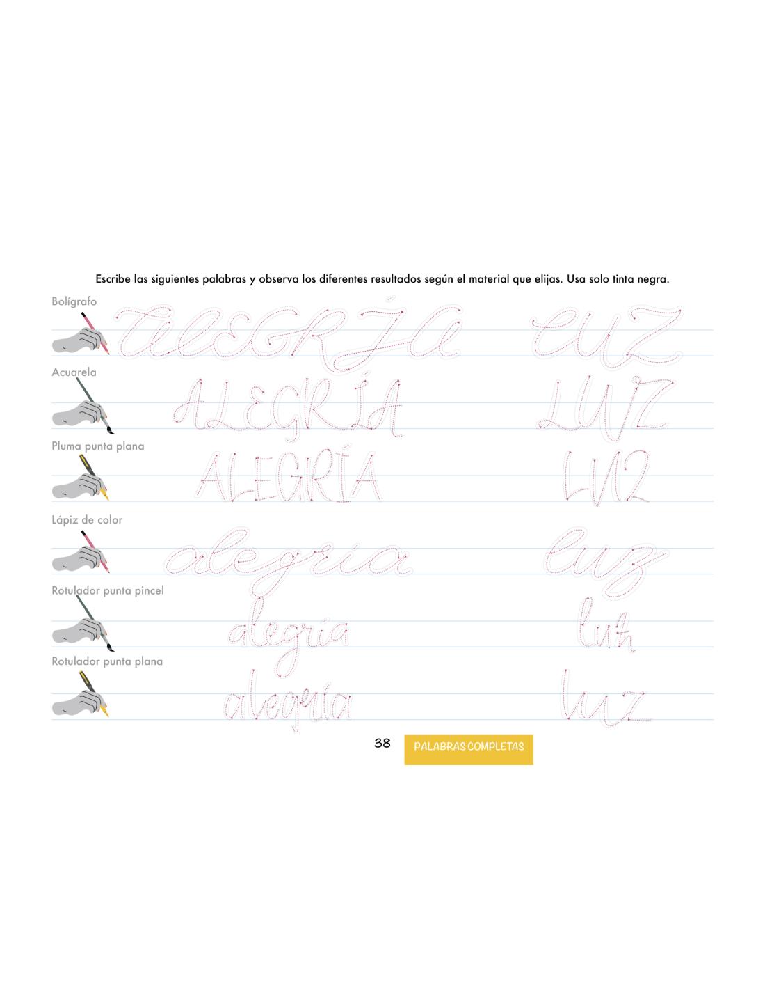 Encontrarás una gran variedad de ejercicios para tres puntas, flexible, rígida redonda y rígida plana, con solo un color o combinando ambos, alternando mayúsculas y minúsculas, además de propuestas dinamizadas para comparar resultados.