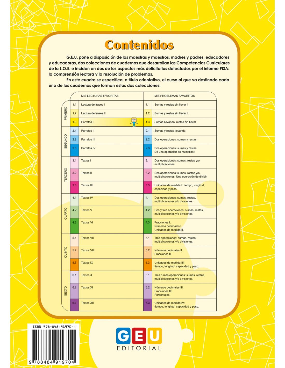 Orientado a 1º de Educación Primaria. Especialmente recomendado para trabajar actividades complementarias en grupos escolares o en casa, reforzar el trabajo con alumnos que presentan algún rezago académico o como ampliación para alumnos proactivos o adelantados. Con letra caligráfica y pauta cuadriculada de 4 mm.