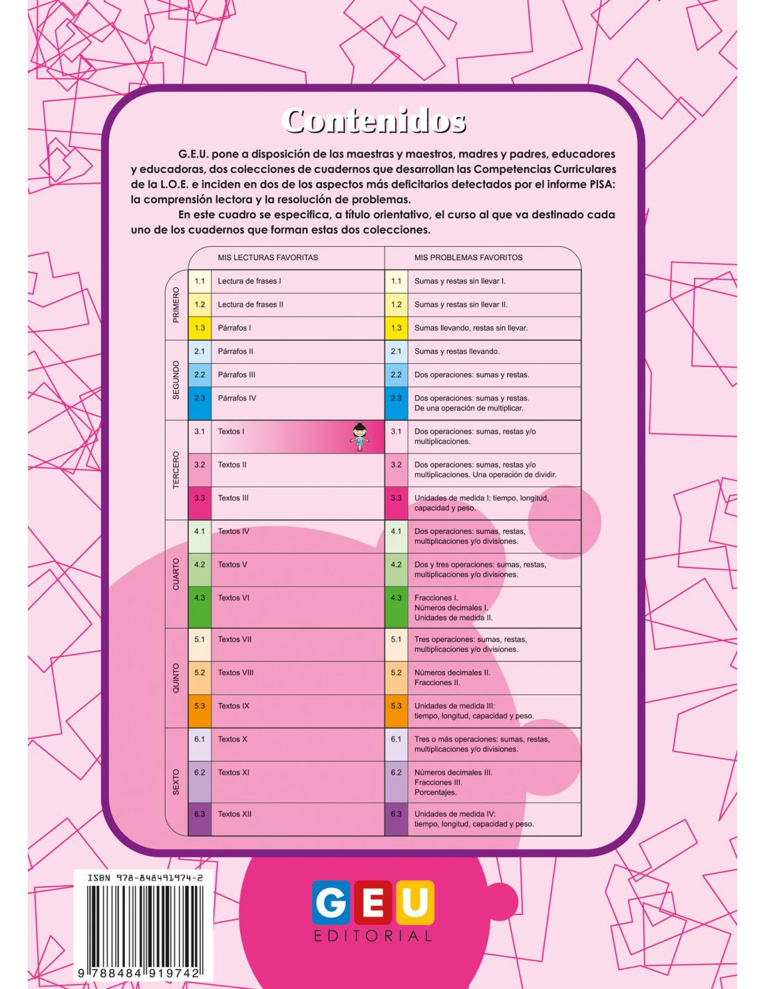 Orientado a 3º de Educación Primaria. Especialmente recomendado para trabajar actividades complementarias en grupos escolares o en casa, reforzar el trabajo con alumnos que presentan algún rezago académico o como ampliación para alumnos proactivos o adelantados. Con letra caligráfica y pauta cuadriculada de 3 mm.