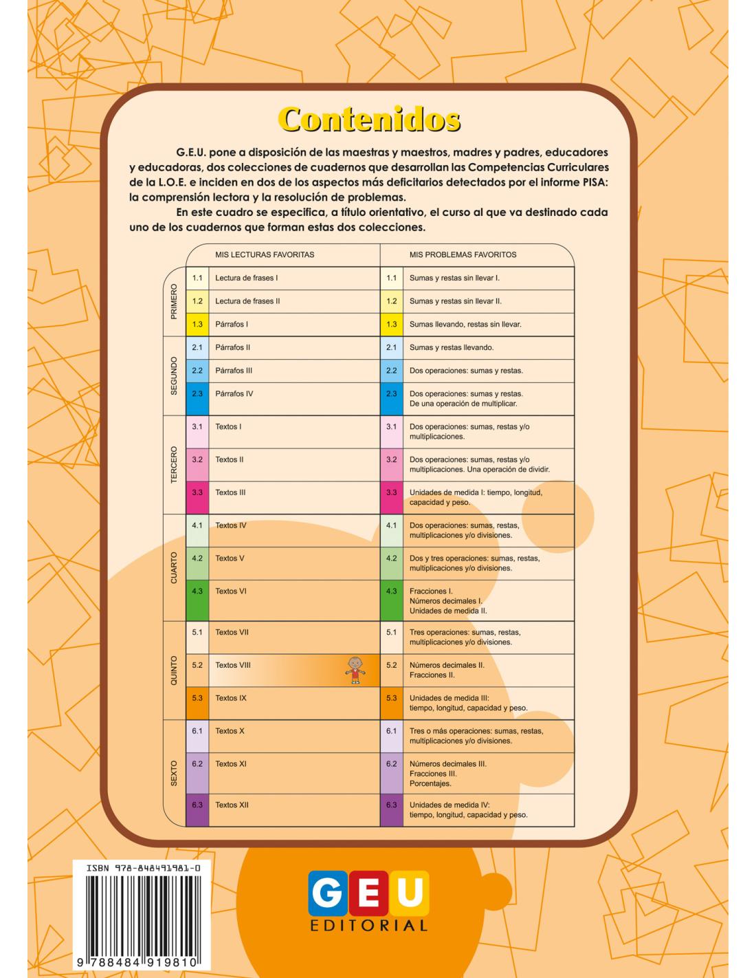 Mis lecturas favoritas 5.2 forma parte de una colección compuesta por 18 cuadernos específicamente diseñados para desarrollar las competencias que les ayudan a comprender lo que leen y así les permite comunicarse de una manera más clara y eficiente.