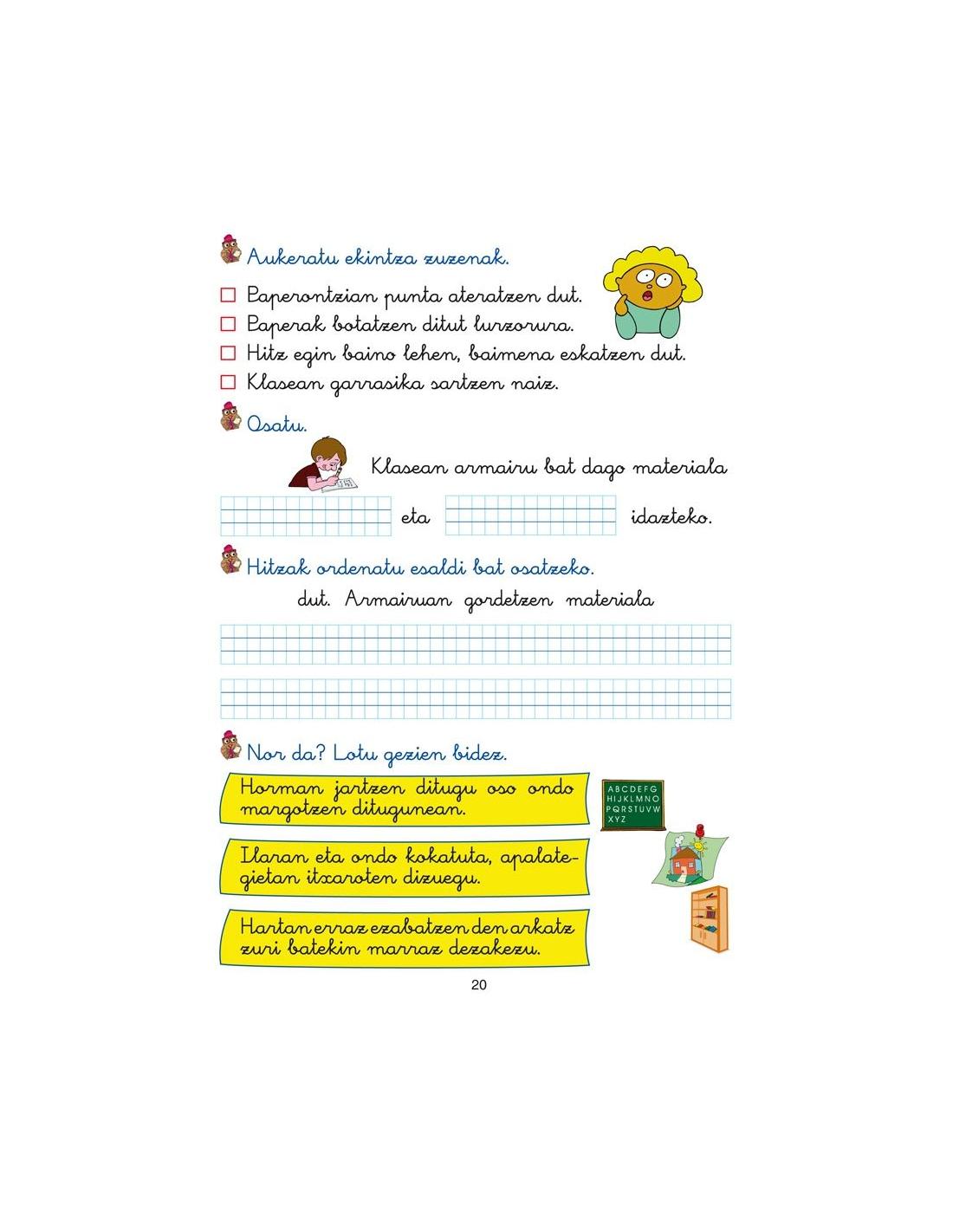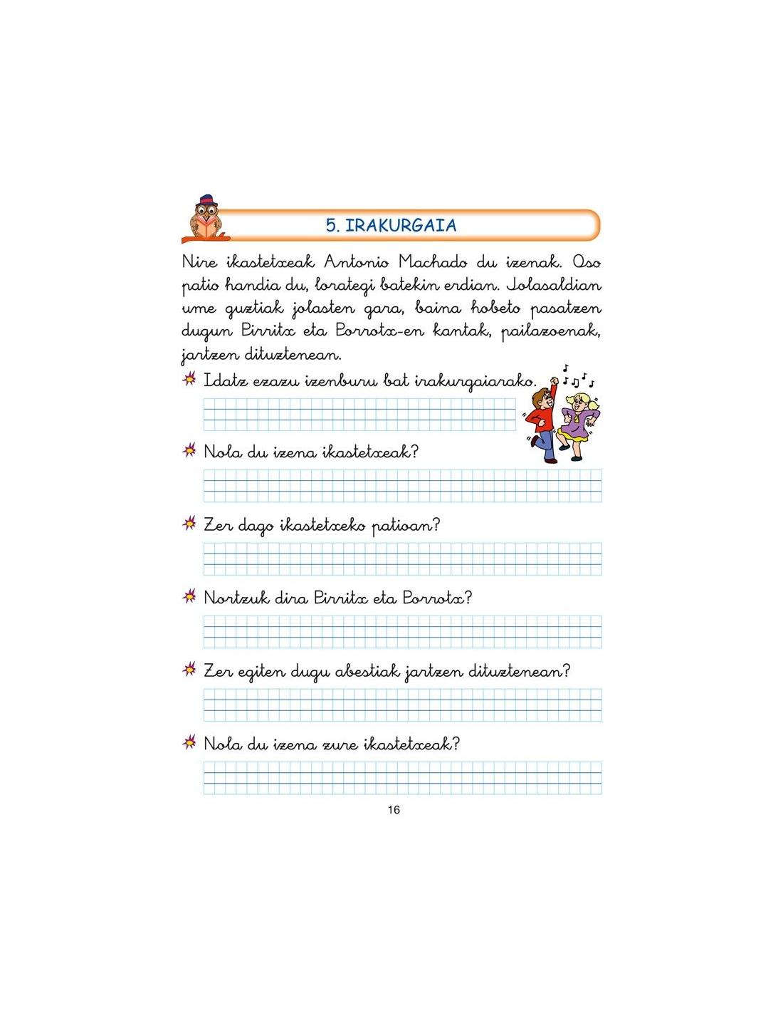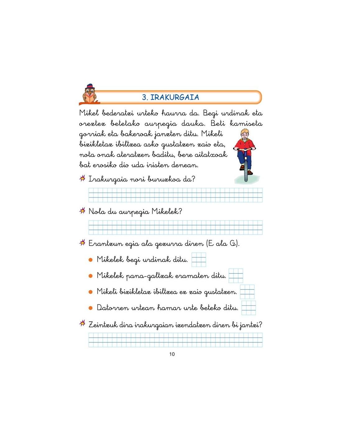 Koaderno honetan hitz gurutzatuak, letra-zopak, enuntziatuaren argibideen arabera antolamendu kronologikoa eta abar aurki ditzakezu. Baita proposatutako testuei buruzko galderak ere. Azken jarduera-mota hauetan ikasleek idatzi behar dute eta horretarako 12mm-ko lauki-sare (4mm-ko 3 karratu) eskaintzen da.