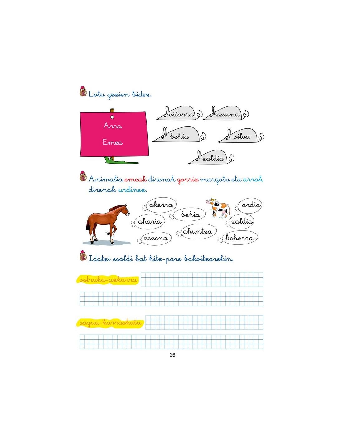 - Gramatika: letrak, silabak eta hitzak; singularra eta plurala; lehenaldia, orainaldia eta geroaldia; izena eta izenondoak; izen bereziak.