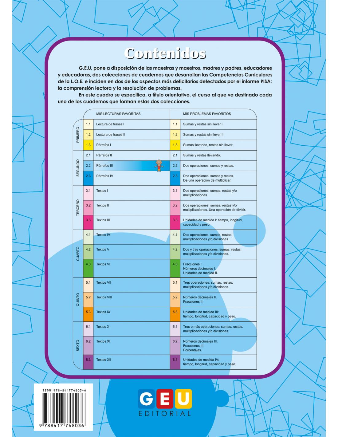 Orientado a 2º de Educación Primaria. Especialmente recomendado para trabajar actividades complementarias en grupos escolares o en casa, reforzar el trabajo con alumnos que presentan algún rezago académico o como ampliación para alumnos proactivos o adelantados. Con letra caligráfica y pauta cuadriculada de 4 mm.