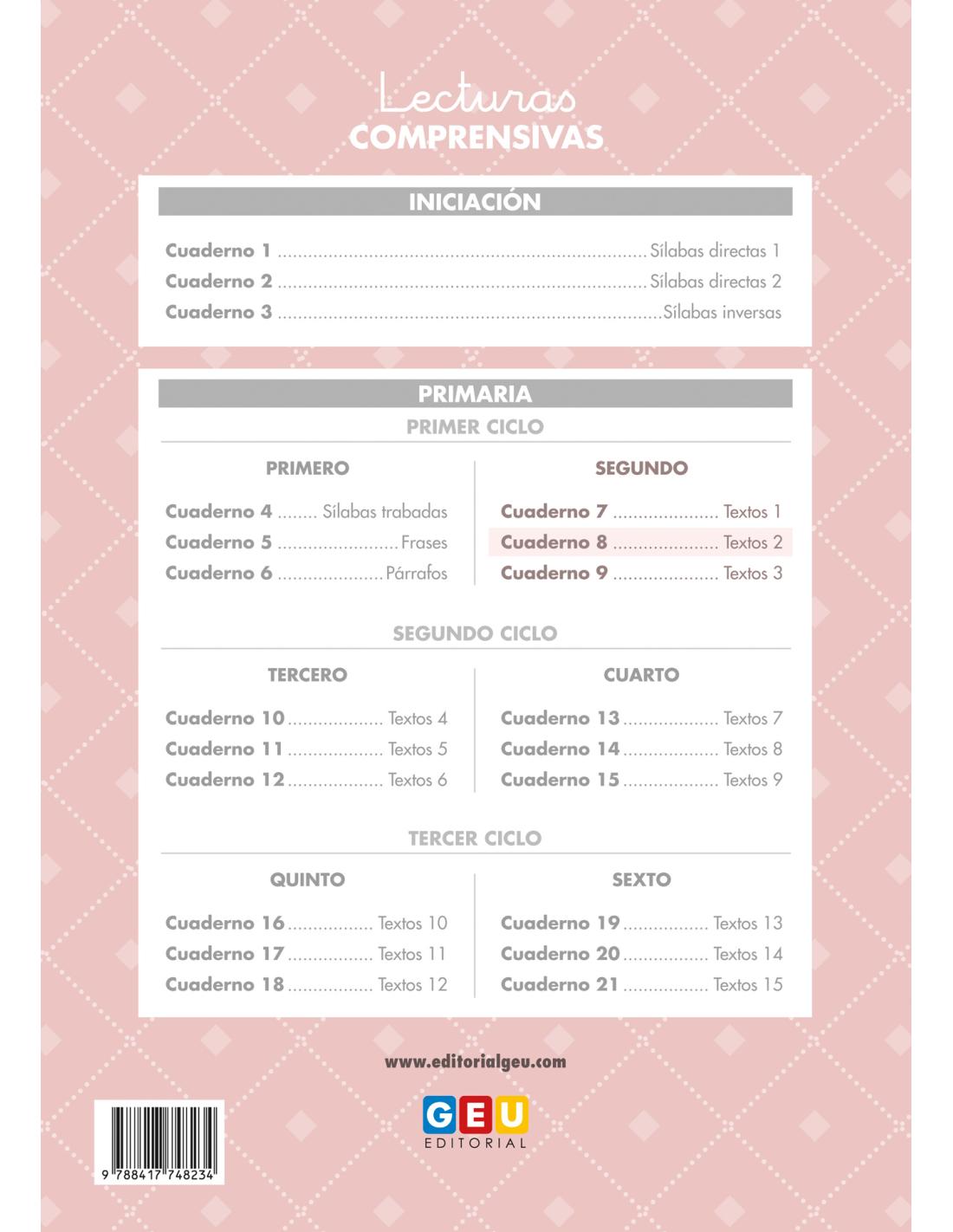 Mejora la comprensión lectora de tu hijo con "Lecturas Comprensivas 8"! La comprensión lectora es una habilidad clave para el éxito académico en todas las materias, pero muchos niños enfrentan dificultades para entender, analizar y retener la información de los textos. Con "Lecturas Comprensivas 8", tu hijo fortalecerá su lectura comprensiva a través de ejercicios prácticos, fichas estructuradas y actividades diseñadas para mejorar la comprensión lectora de forma divertida y eficaz. Este libro, ideal para alumnos de 2º de primaria, sigue una pauta cuadrícula que facilita la escritura y organización de ideas. A través de ejercicios de comprensión lectora, juegos interactivos y actividades de repaso de ortografía y gramática, los niños desarrollarán habilidades esenciales para interpretar textos, mejorar su vocabulario y escribir con mayor claridad. Además, este material fomenta un aprendizaje progresivo, permitiendo que los pequeños adquieran autonomía y confianza en su lectura, al mismo tiempo que disfrutan de actividades dinámicas y entretenidas. Gracias a este enfoque, "Lecturas Comprensivas 8" no solo refuerza el rendimiento escolar, sino que también impulsa el pensamiento crítico y la creatividad, brindando a los niños herramientas fundamentales para su desarrollo intelectual. Ideal para refuerzo escolar, fichas de comprensión lectora y actividades de repaso de vocabulario y composición escrita. ¡Convierte la lectura en una experiencia enriquecedora y divertida para tu hijo!