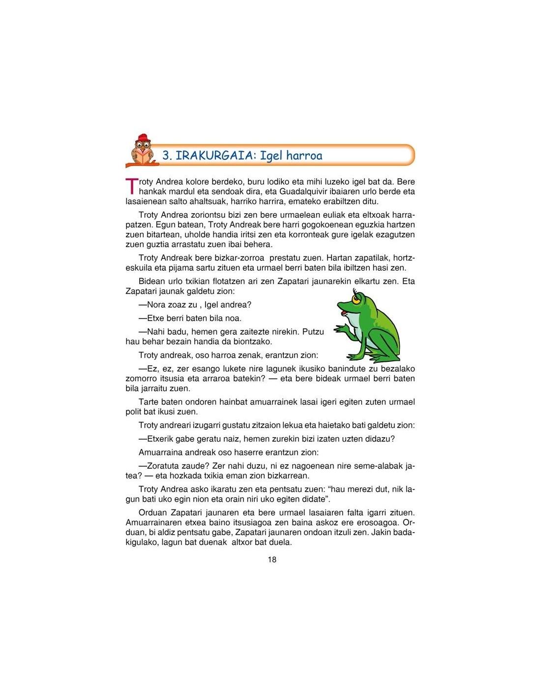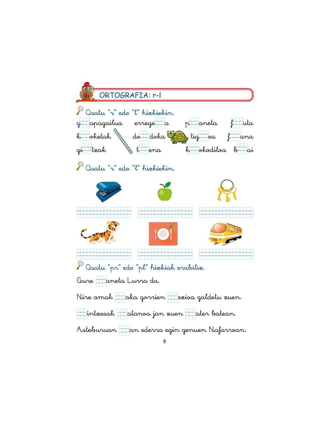 - Gramatika: letrak, silabak eta hitzak; singularra eta plurala; lehenaldia, orainaldia eta geroaldia; izena eta izenondoak; izen bereziak.