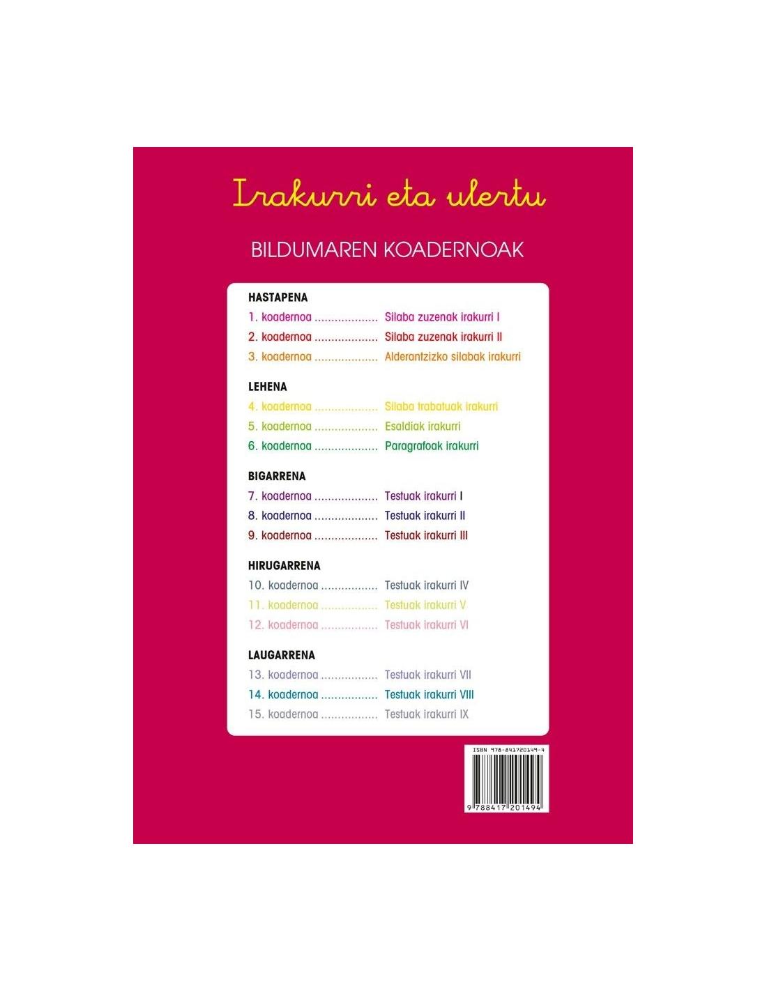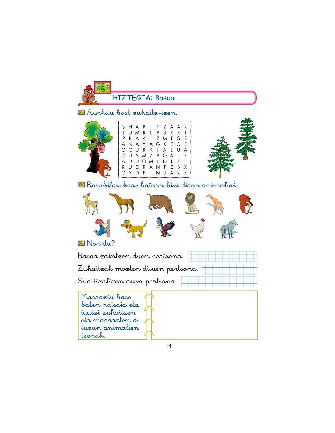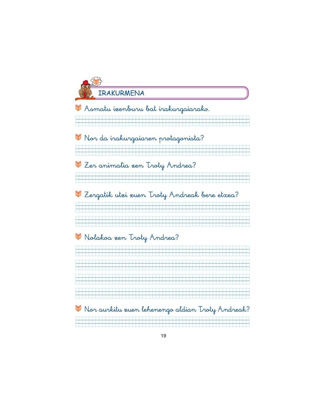 Koaderno honetan hitz gurutzatuak, letra-zopak, enuntziatuaren argibideen arabera antolamendu kronologikoa eta abar aurki ditzakezu. Baita proposatutako testuei buruzko galderak ere. Azken jarduera-mota hauetan ikasleek idatzi behar dute eta horretarako 12mm-ko lauki-sare (4mm-ko 3 karratu) eskaintzen da.