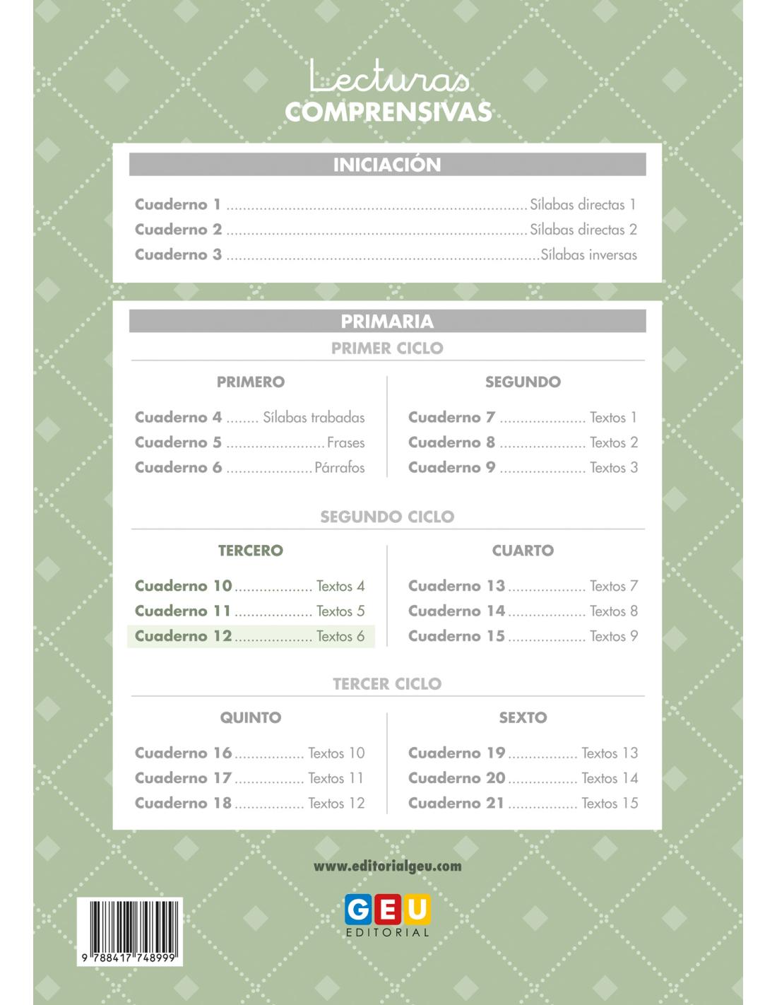 El cuaderno 12 de Lecturas comprensivas forma parte de una colección de 21 cuadernos dedicados a comprensión lectora. Este cuaderno, junto con el 10 y el 11 son el apoyo idóneo para alumnos de 3º de Primaria.