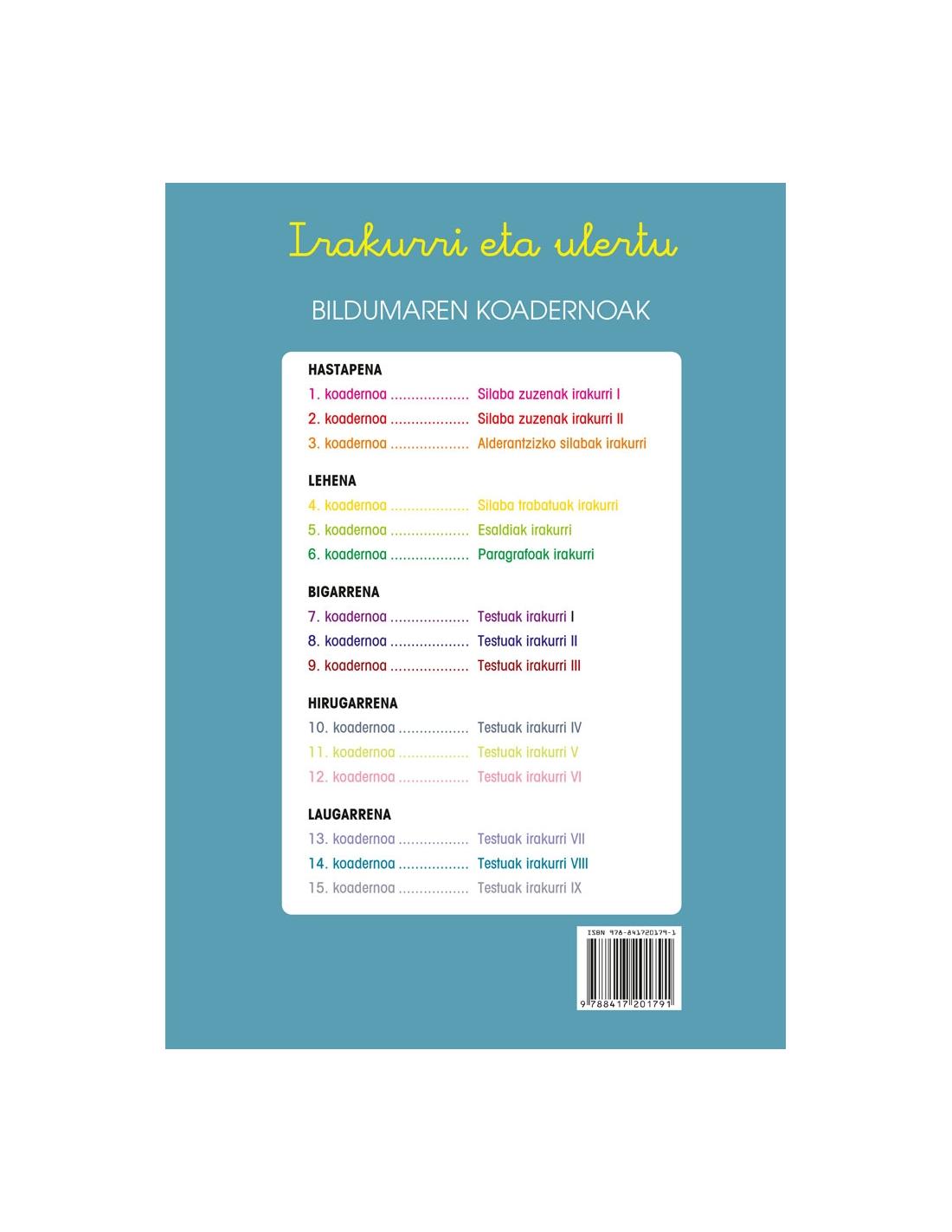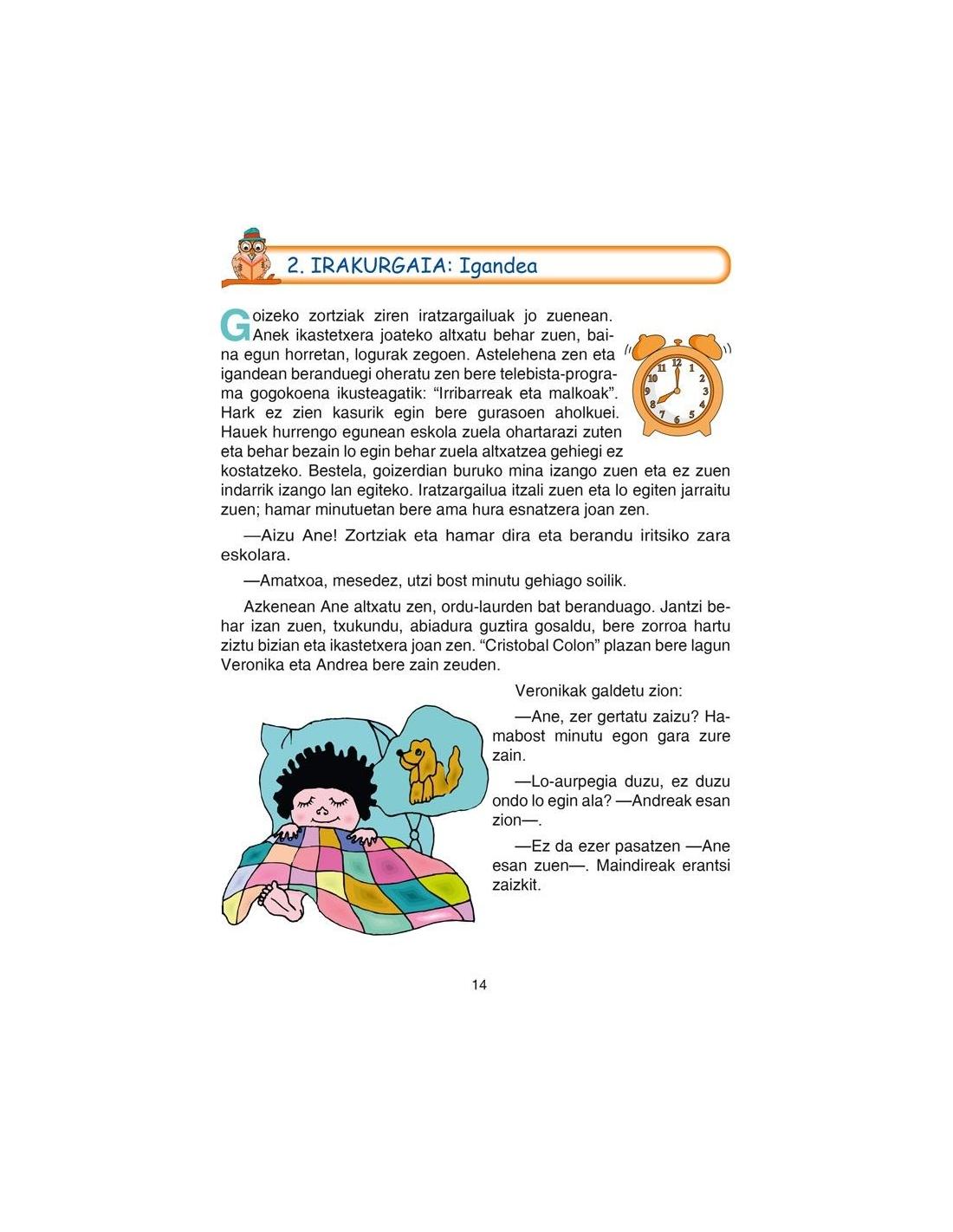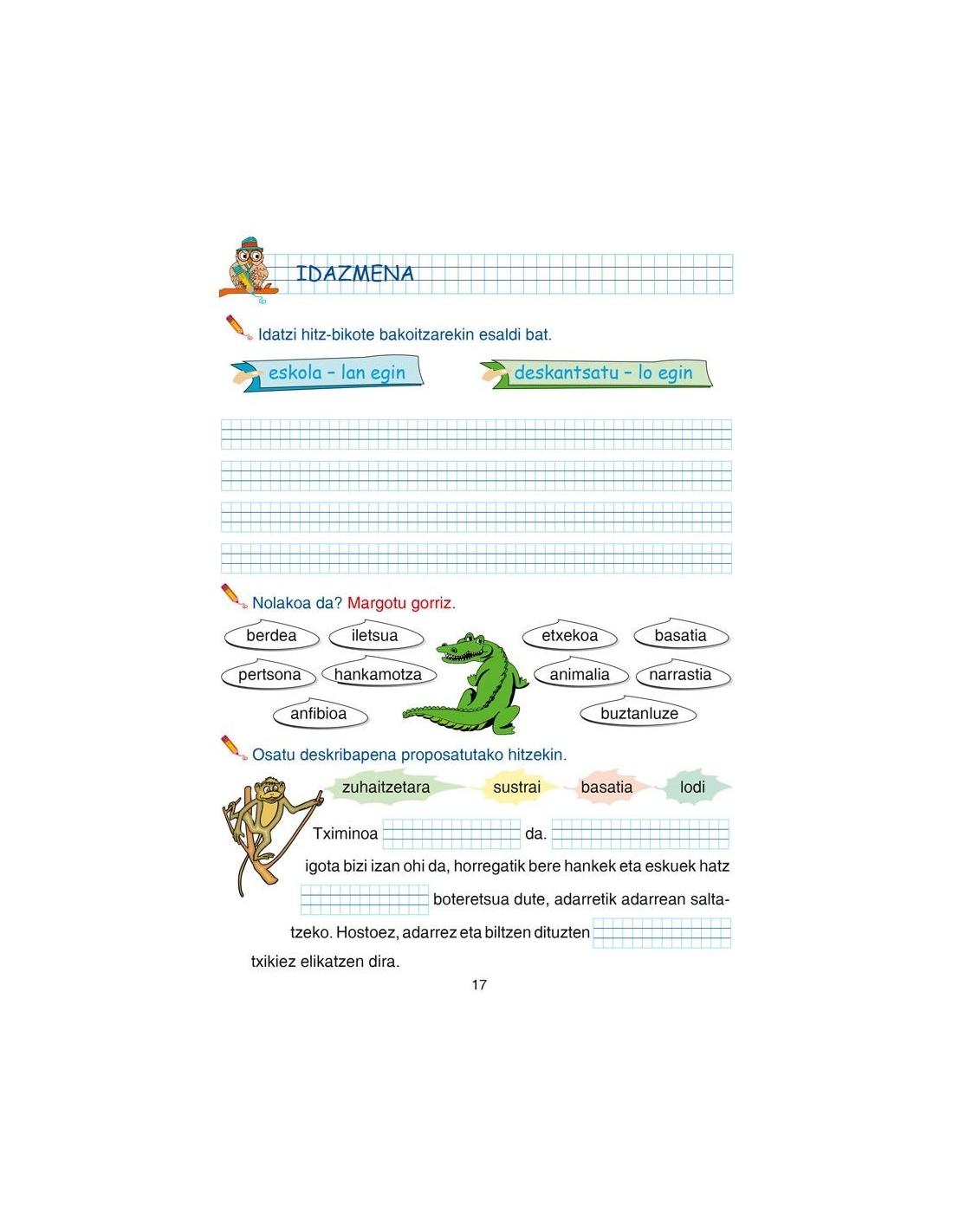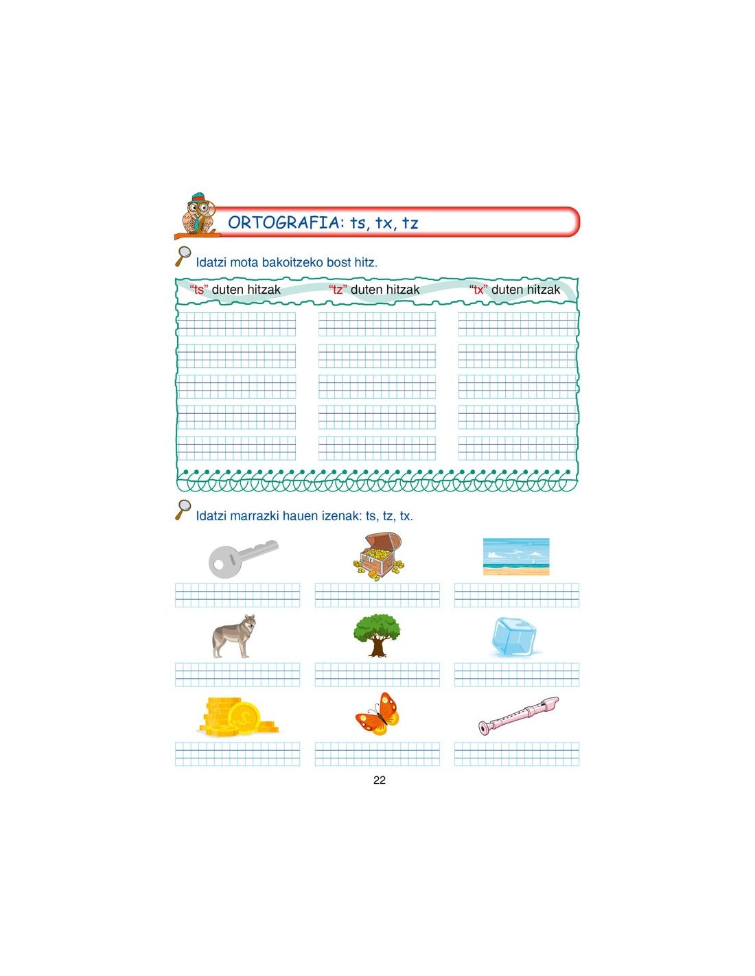 Gainera, koadernoan irakurketaren aitzakia erabiltzen da ortografia (s-x-z, ts-tx-tz, h, r-rr, bdd-tt-ñ-ll) gramatika eta hiztegia hobetzeko.