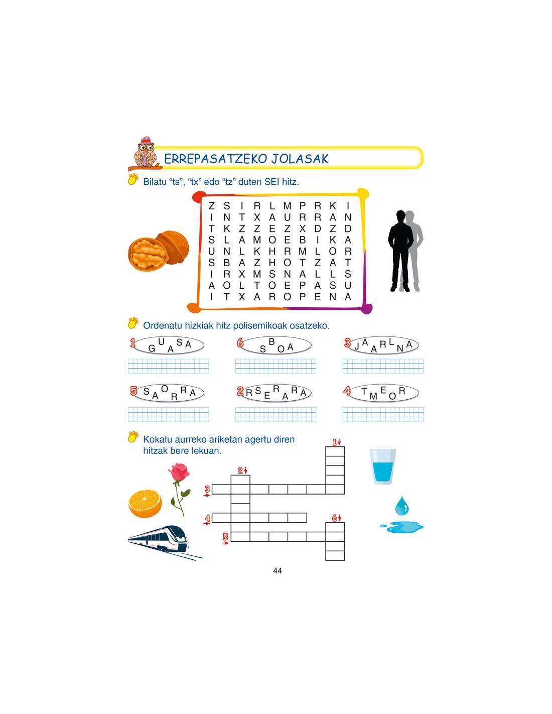 Testuez gain, koadernoan hizkuntzaren alderdiak hobetzeko jarduerak ere sartzen dira, hala nola ortografia, gramatika eta hiztegia. Ariketa asko eta askotarikoak aurkezten dira, besteak beste, letra-zopak, gurutzegramak, kontzeptuen zerrenda, testuaren hutsuneak osatzea eta abar.
