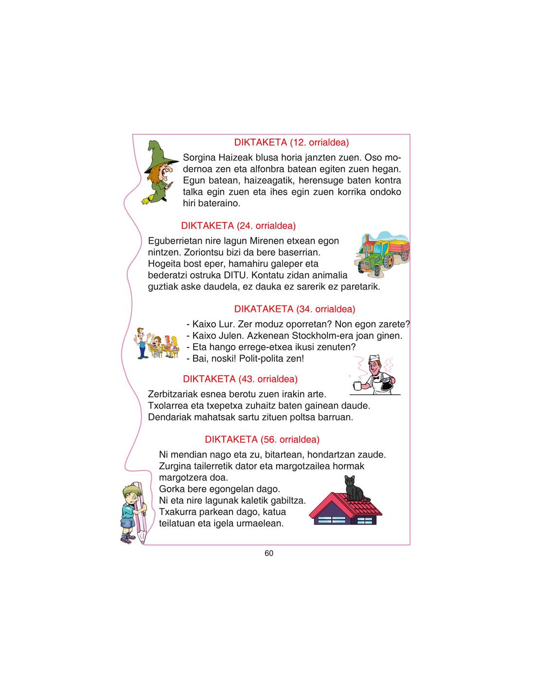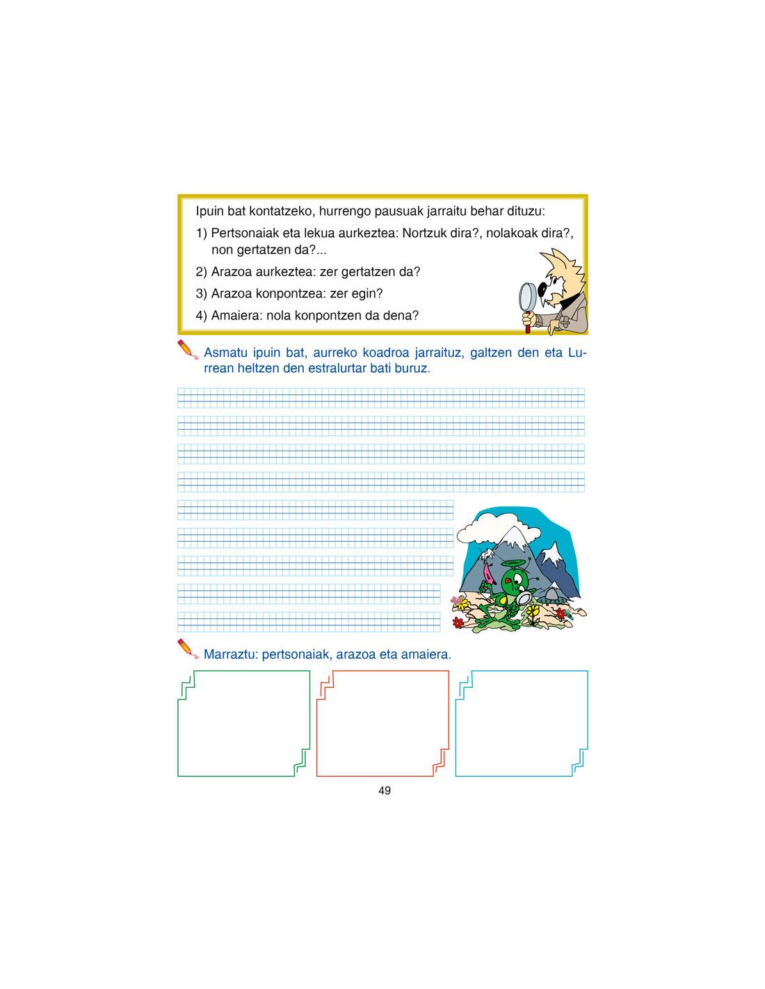 •Kronologikoki ordenatutako narrazio testuak sortzea, irudiak deskribatzea, narrazioa egitea bere egitura kontuan hartuz, ipuin baten zati desberdinen konposizioa.