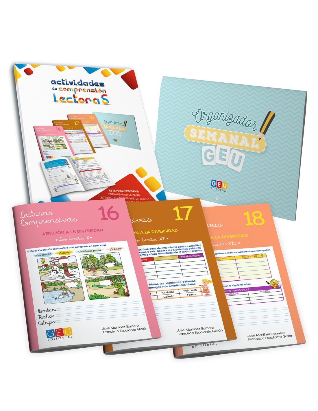 1. PACK LECTURAS COMPRENSIVAS GEU - Incluye los cuadernos 16, 17 y 18 de Lecturas Comprensivas de GEU Editorial con textos y actividades para niños de quinto de primaria. Trabajan comprensión lectora, gramática, vocabulario y ortografía 5 primaria