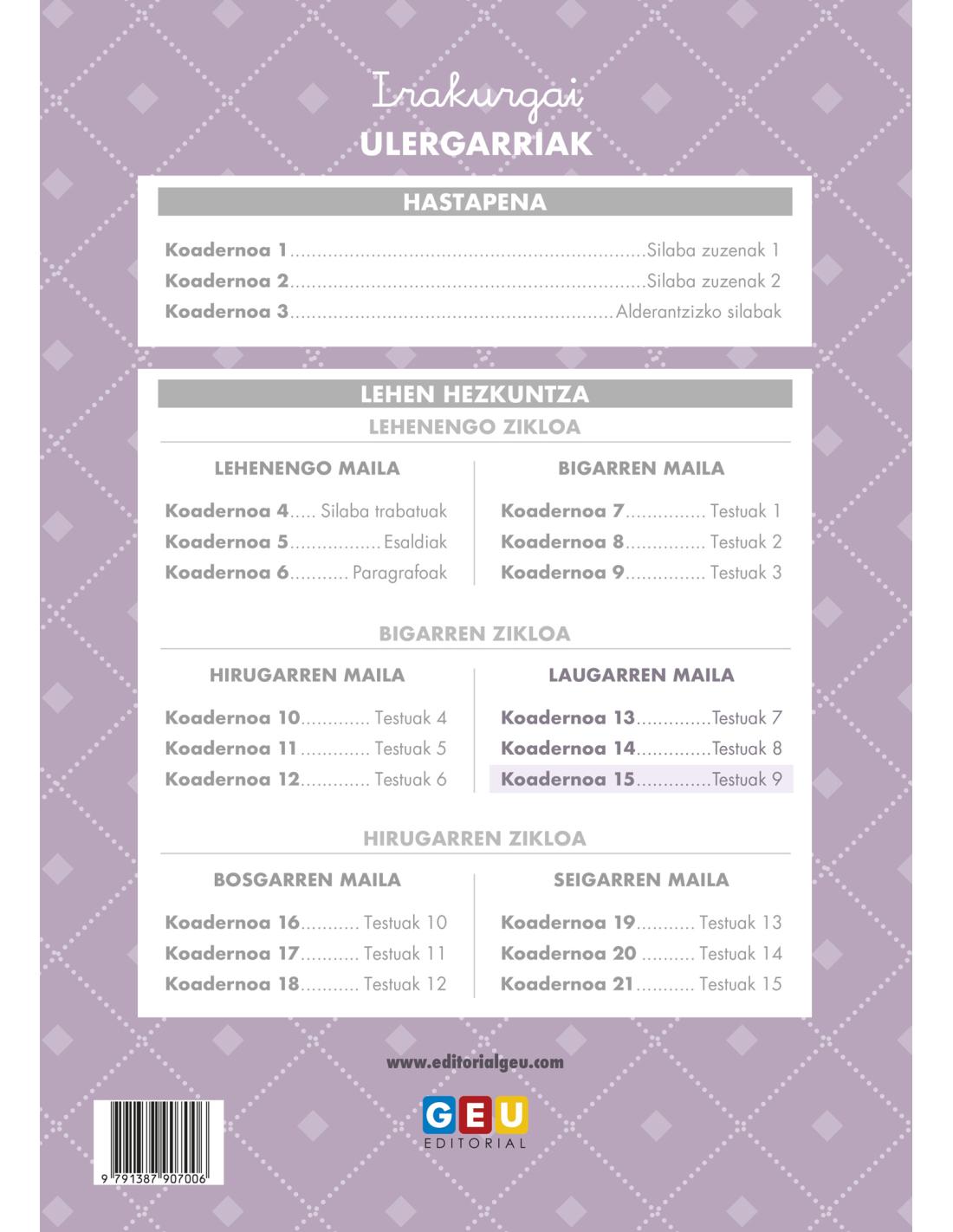 Irakurgai ulergarriak 15 koadernoa material praktikoa da, ikasleek irakurmenaren ulermena hobetzearekin batera hizkuntzaren beste alderdi batzuk ere landu ditzaten, batez ere ortografia (puntua eta bi puntuak; marra, parentesia eta eten puntuak: galdera. eta harridura- markak; koma eta puntu eta koma), hiztegia eta gramatika, baita idazmenaren garapena ere (narrazio-testuen idazketa, liburuen iruzkinak, eta abar).