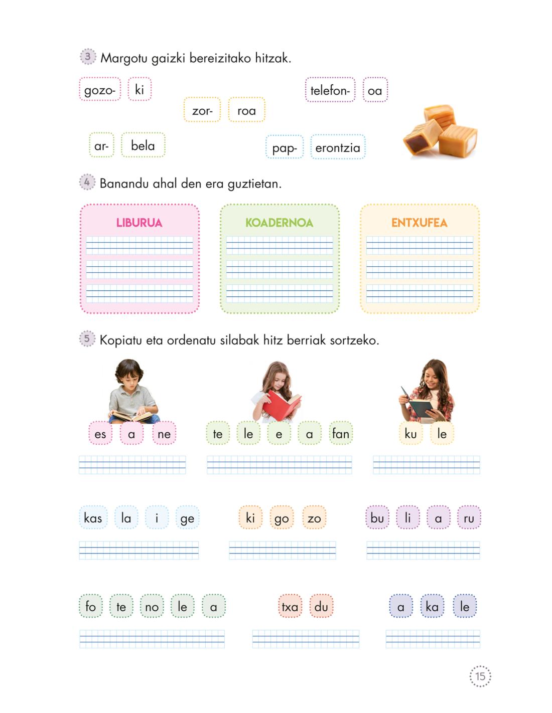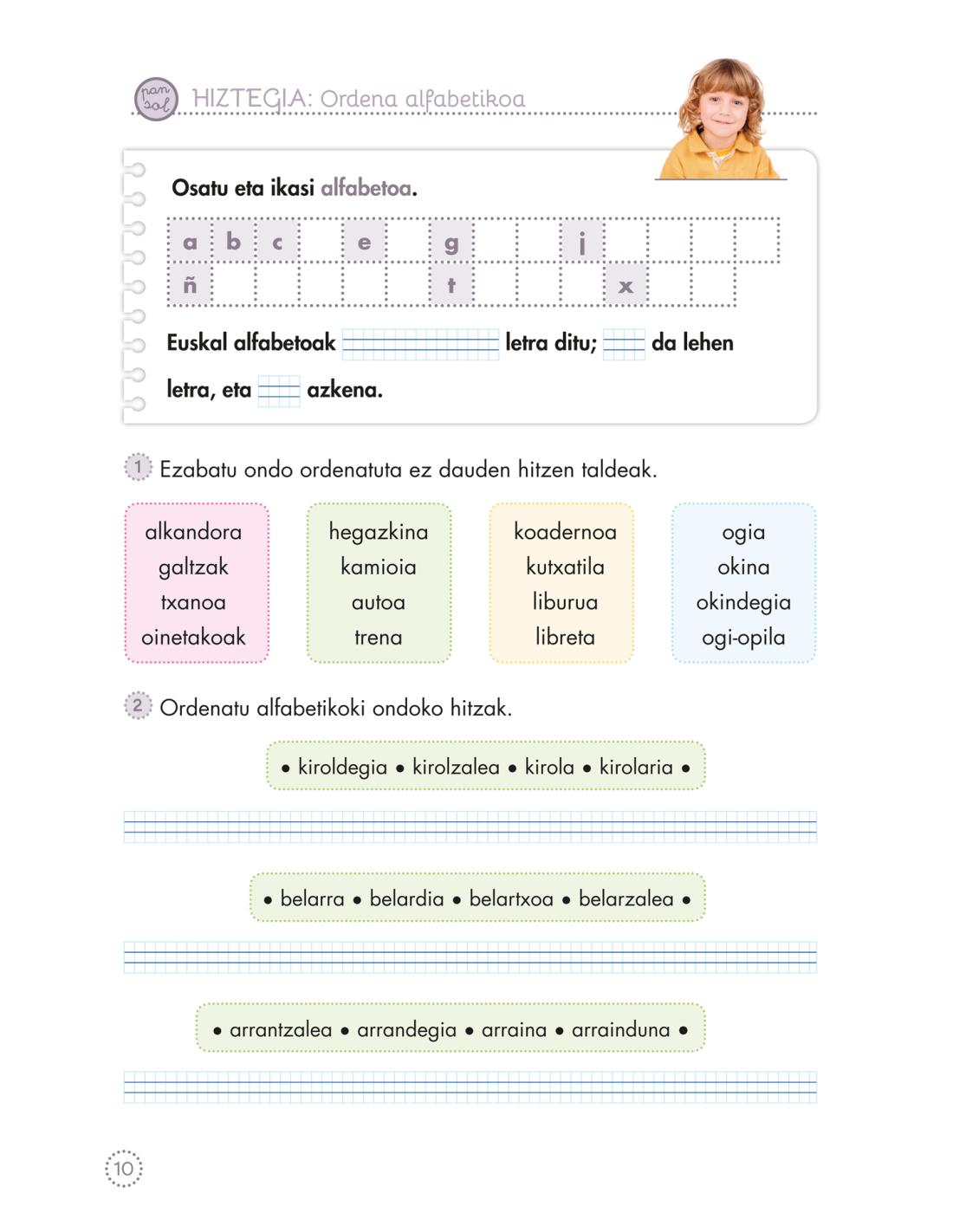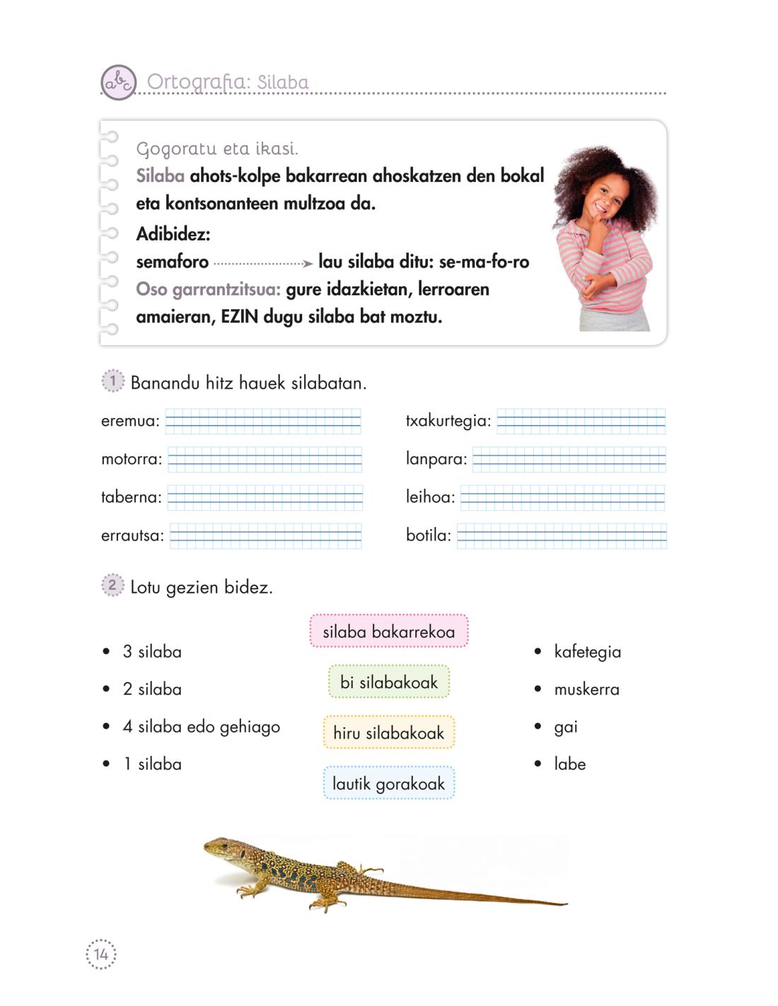 • Hiztegia: silabak bereiztea, atzizkien esanahia (-tsu, -ti, -zale), handigarriak (-tzar, -kote) eta txikigarriak (-txo, -ó, -ila).