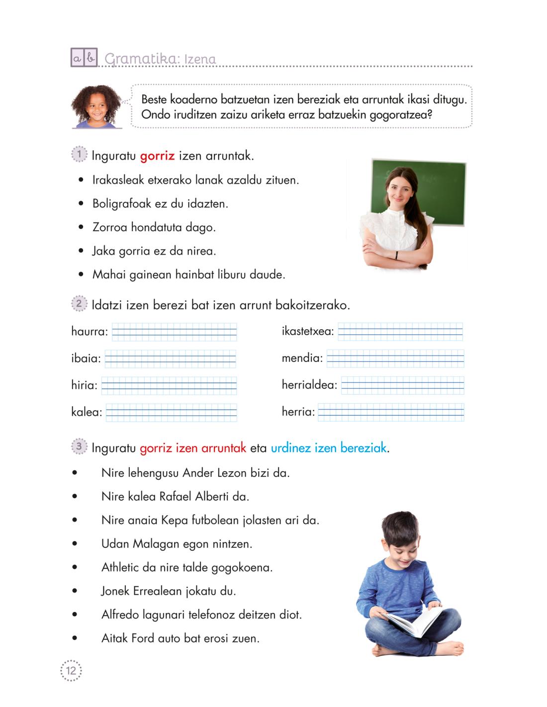 • Gramatika: izen arruntak, bereziak, indibidualak eta multzokariak; izenondoak; NOR-NOR kasua; eta singular/plural erabilera.