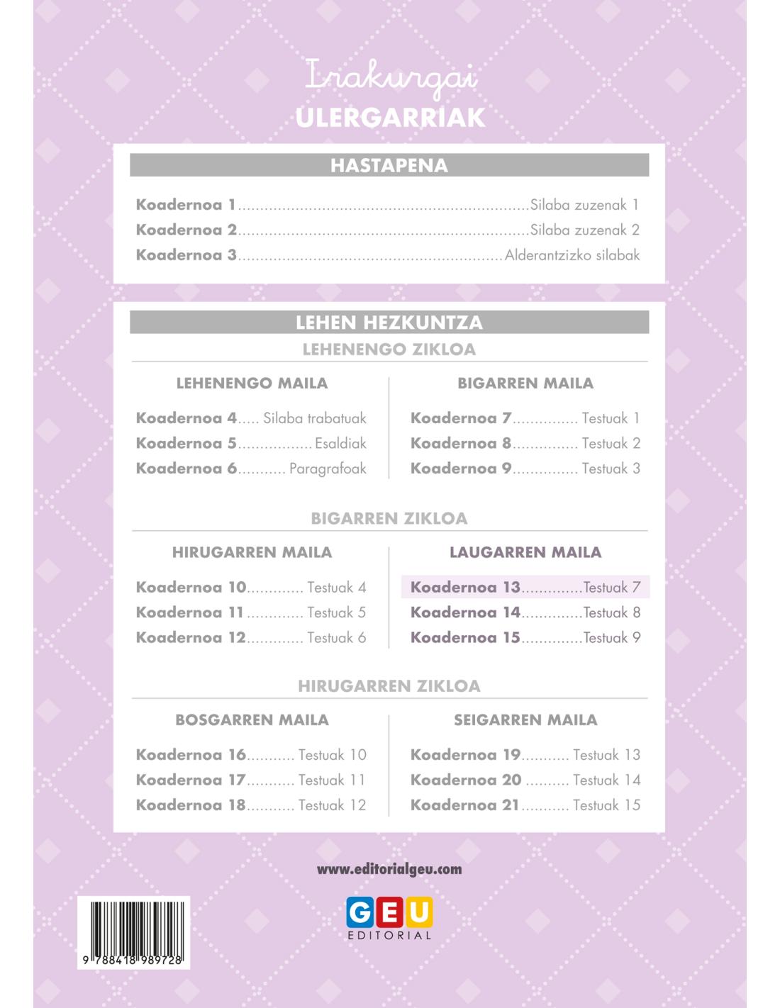 "Irakurgai ulergarriak 13" Lehen Hezkuntzako 4. mailako ikasleei zuzendutako hiru koadernoetako lehena da. Koaderno praktiko hau 550 hitzetarainoko testuekin dago osatuta, eta helburua da ikasleen irakurmen-gaitasuna hobetzea era entretenigarrian.