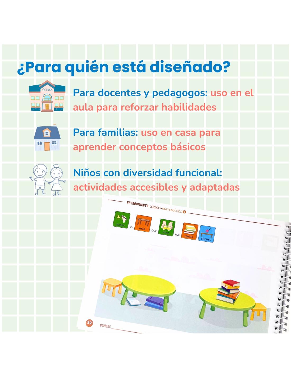 Este cuaderno es el segundo de una colección de 5 cuadernos de Razonamiento lógico-matemático, con un enfoque progresivo que permite a los niños continuar aprendiendo de manera estructurada. Incluye pictogramas en letra mayúscula en los enunciados, facilitando la comprensión lectora y la autonomía en la resolución de ejercicios.