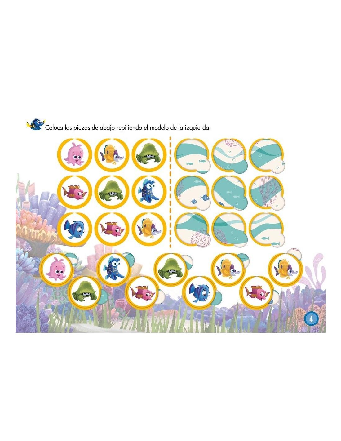 El libro-juego de Buscando a Dory está compuesto por 12 páginas en las cuales se incluyen diversos ejercicios para aprender conceptos básicos de lateralidad y percepción espacial. Además, incluye pictogramas para facilitar su comprensión mientras disfrutan y aprenden con Dory y sus divertidos amigos bajo el mar.
