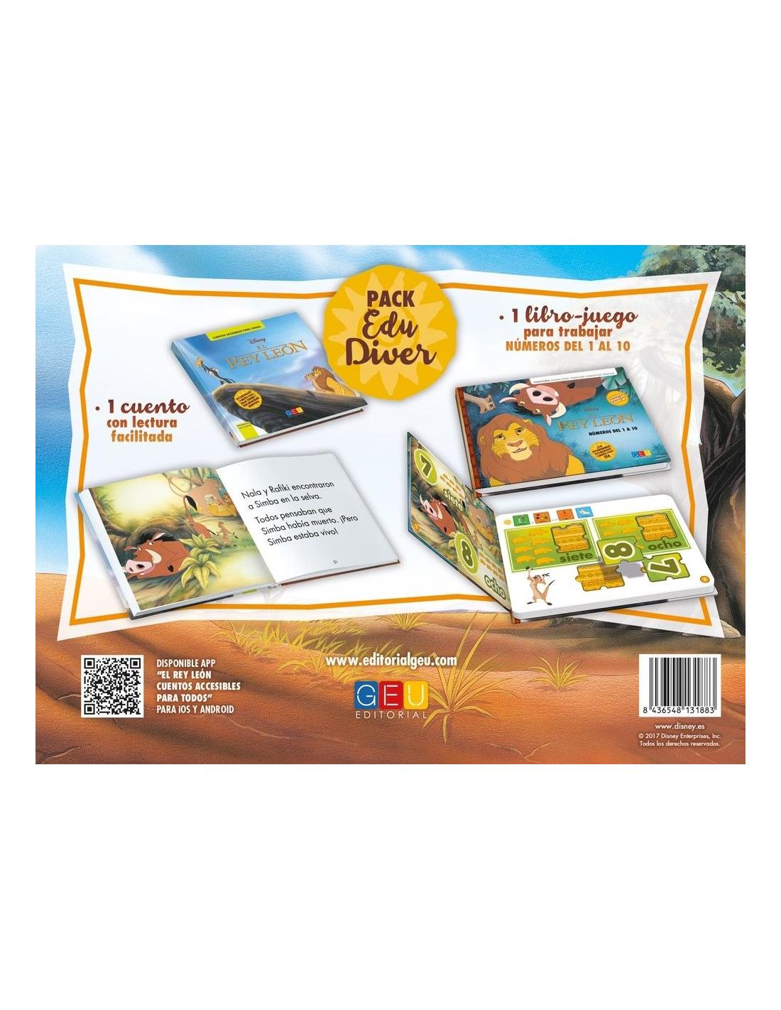 El pack EduDiver de El Rey León se compone de un cuento en lectura facilitada de El Rey León y un libro-juego de El Rey León para aprender los números del 1 al 10. Se trata de dos materiales únicos con los que los más pequeños aprenderán acompañados de sus personajes Disney favoritos.