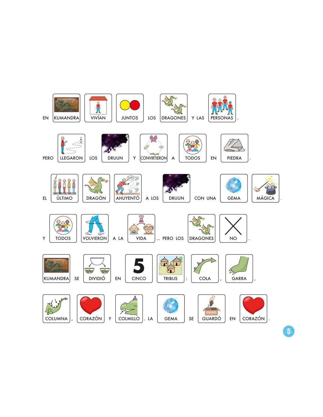 En otros casos en los que el niño o la niña ya se esté familiarizando con cuentos con pictogramas de niveles más iniciales de la lectura, encontrará en este título un nivel superior, con más cantidad de texto y vocabulario y siempre con nuestro sistema de pictogramas en letra mayúscula para facilitar la comprensión.