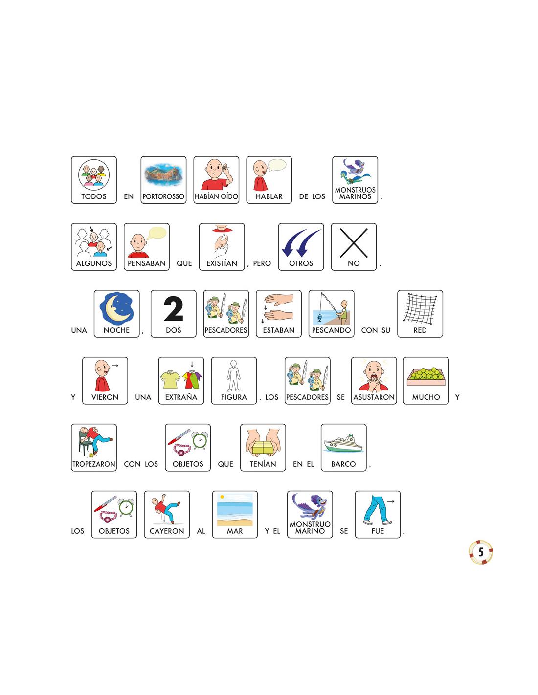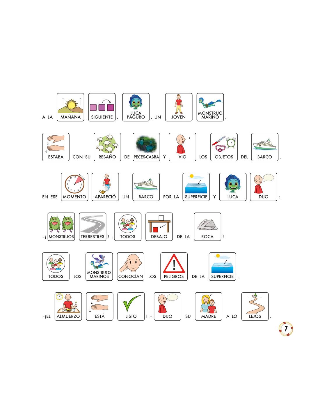 En otros casos en los que el niño o la niña ya se está familiarizado con cuentos con pictogramas de niveles más iniciales de lectura, con más cantidad de texto y vocabulario y siempre con nuestro sistema de pictogramas en letra mayúscula para facilitar la comprensión.