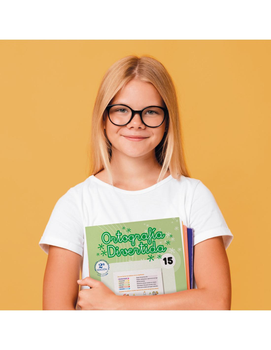Ortografía Divertida 15 es un cuaderno didáctico diseñado para que niños y niñas de 10 a 11 años (5º de Educación Primaria) refuercen las reglas básicas de ortografía de manera divertida, autónoma y eficaz. Forma parte de una colección de 19 cuadernos que abordan progresivamente los principales contenidos ortográficos del currículo escolar.