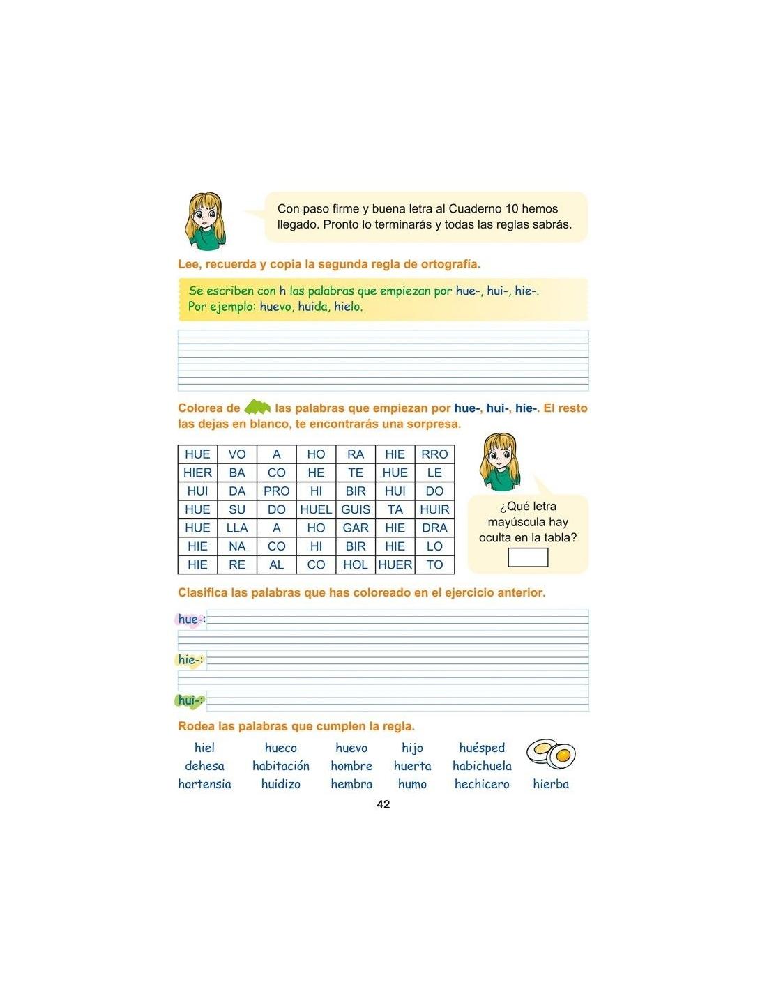 - Repaso del cuaderno 10 (h– en palabras que empiezan por hue-, hui-, hie-. –v– en adjetivos que terminan en –ava, -ave; diptongos y triptongos; jugamos con las palabras).