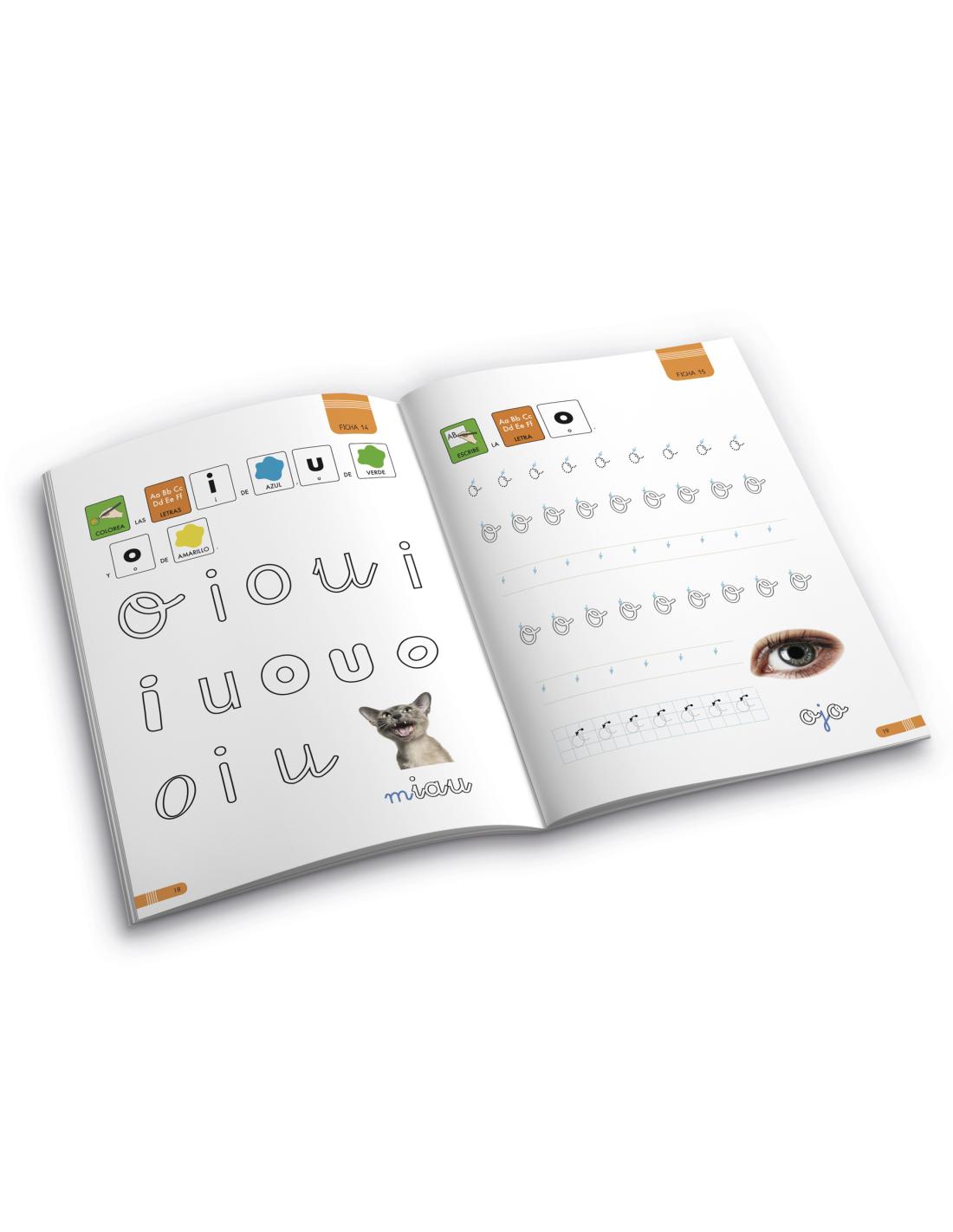 Este cuaderno en concreto, trabaja las vocales en minúscula: i, e, a, o, u.