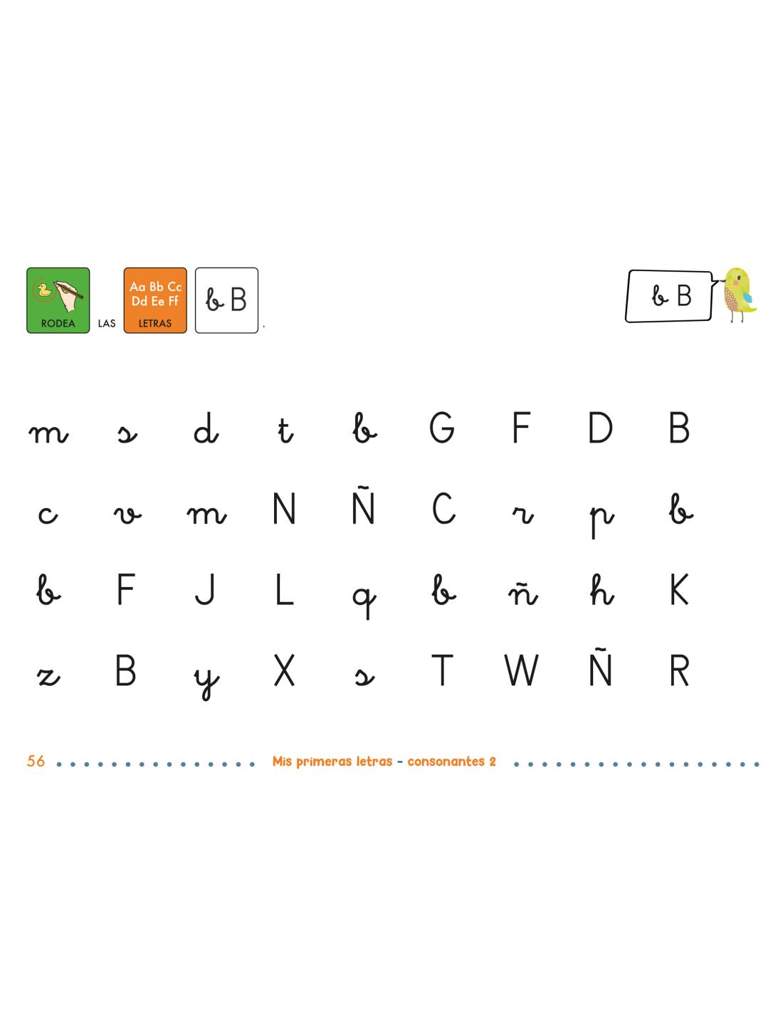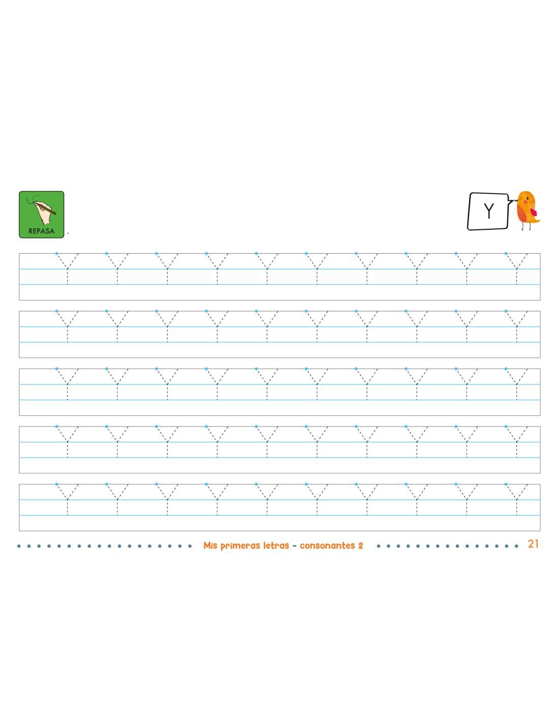En este segundo volumen se trabajan las consonantes j, y, ll, b, v, z, c y r, tanto en minúscula como en mayúscula, ampliando el repertorio de letras y afianzando los primeros aprendizajes.