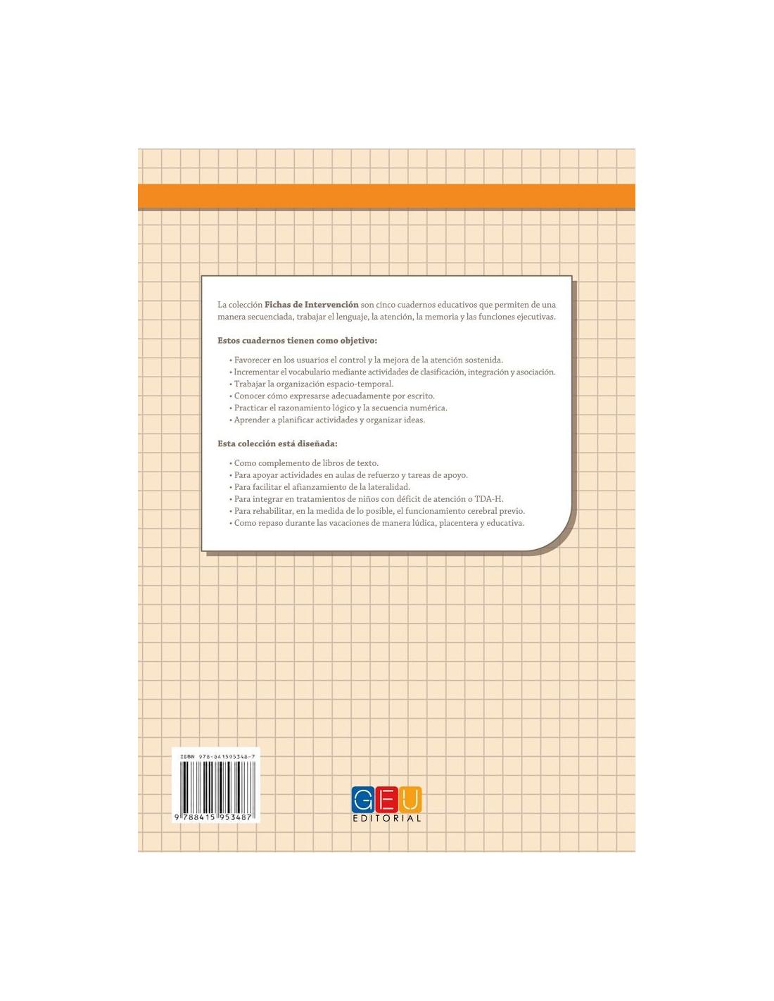Fichas de intervención 4 forma parte de la colección Fichas de intervención, una colección de 5 cuadernos de trabajo con dificultad progresiva creados para desarrollar de una forma fácil y sencilla aspectos como el lenguaje, la atención, la memoria y las funciones cognitivas.