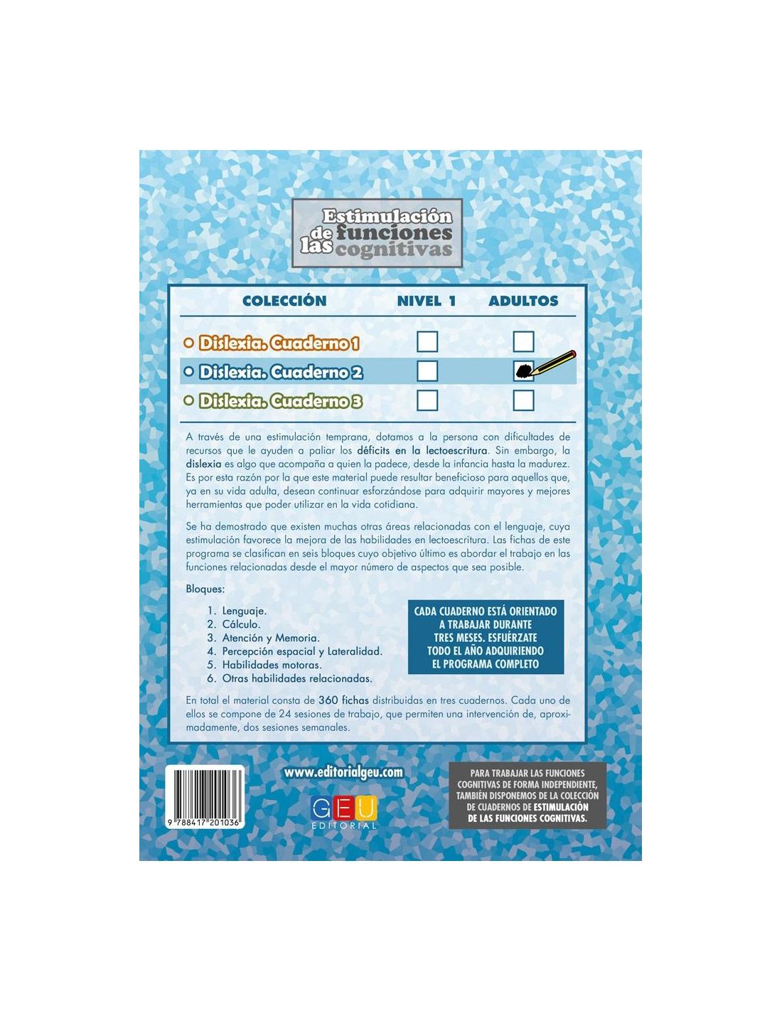 Dislexia Adultos. Cuaderno 2 forma parte de una colección compuesta por 3 cuadernos de trabajo para estimular las funciones cognitivas y el lenguaje.