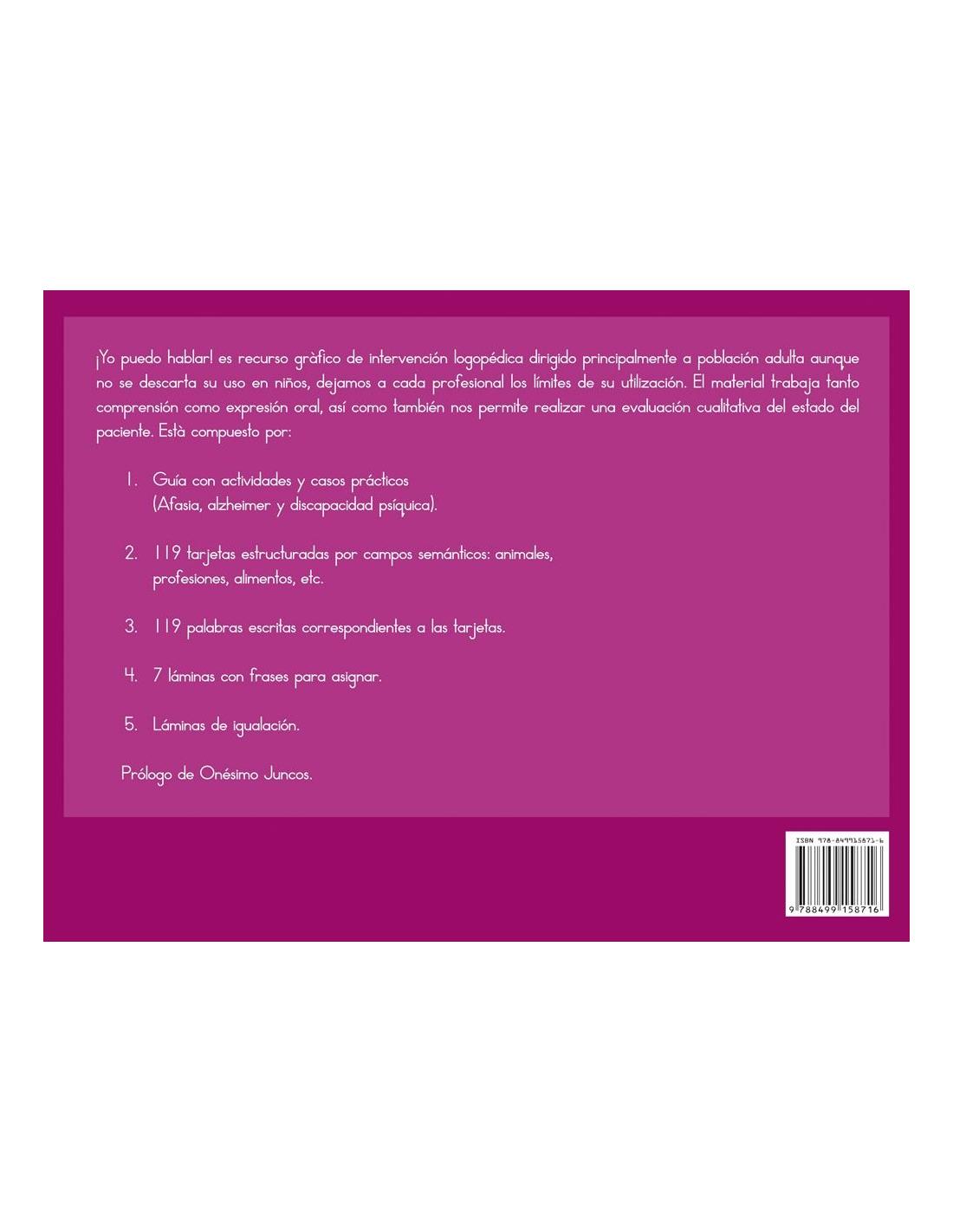 Yo puedo hablar es un recurso gráfico dirigido a adultos con problemas de comunicación y lenguaje, con el objetivo de ayudarlos en su rehabilitación. El material trabaja tanto comprensión como expresión oral, también permite realizar una evaluación previa del estado del paciente.