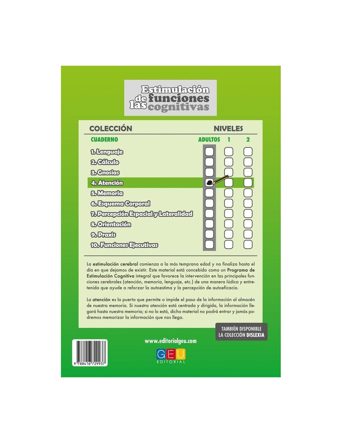 La estimulación cerebral comienza a la más temprana edad y no finaliza hasta el día en que dejamos de existir. Este cuaderno, Atención, forma parte de la colección Estimulación de las Funciones Cognitivas para Adultos, material que está concebido como un Programa de Estimulación Cognitiva integral que favorece la intervención en las principales funciones cerebrales (atención, memoria, lenguaje, etc.), de una manera lúdica y entretenida, que ayude a reforzar la autoestima y la percepción de autoeficacia.