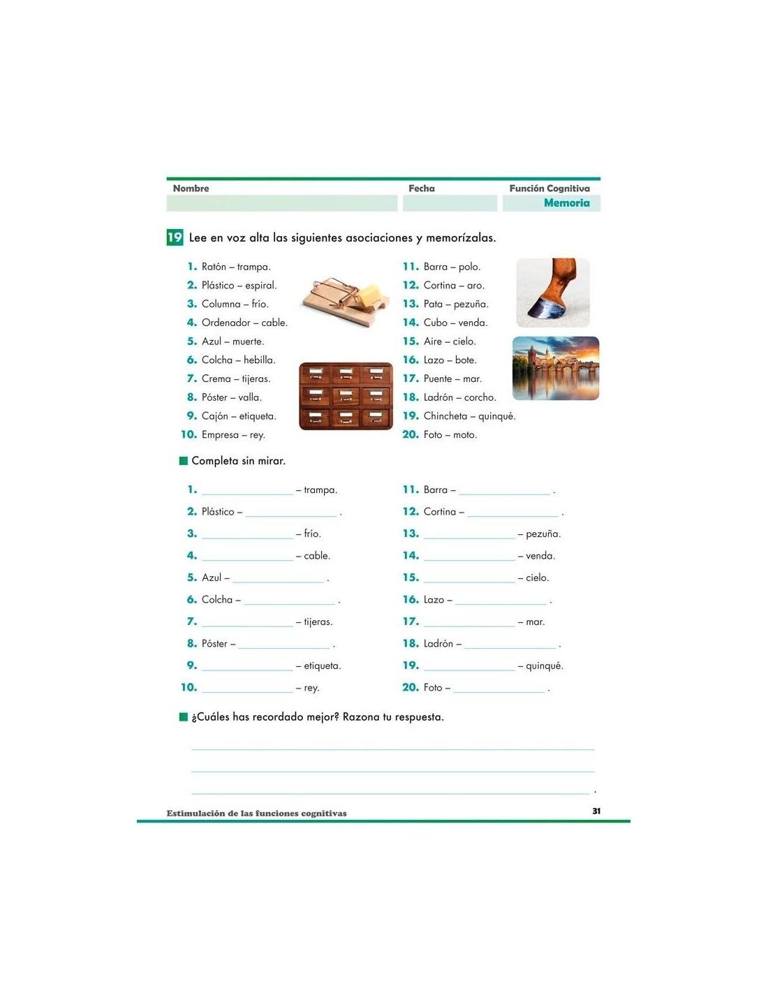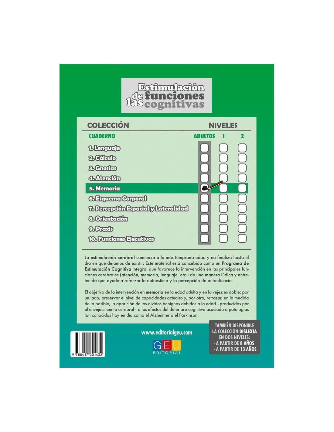 La estimulación cerebral comienza a la más temprana edad y no finaliza hasta el día en que dejamos de existir. Este cuaderno, Memoria, forma parte de la colección Estimulación de las Funciones Cognitivas para Adultos, material que está concebido como un Programa de Estimulación Cognitiva integral que favorece la intervención en las principales funciones cerebrales (atención, memoria, lenguaje, etc.), de una manera lúdica y entretenida, que ayude a reforzar la autoestima y la percepción de autoeficacia.