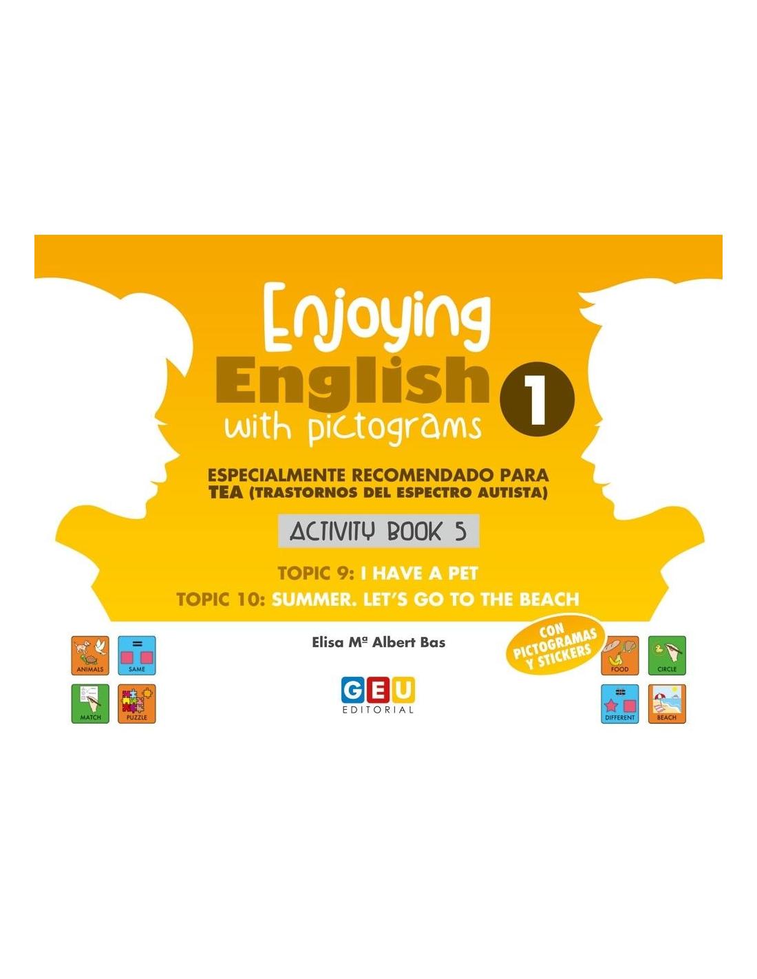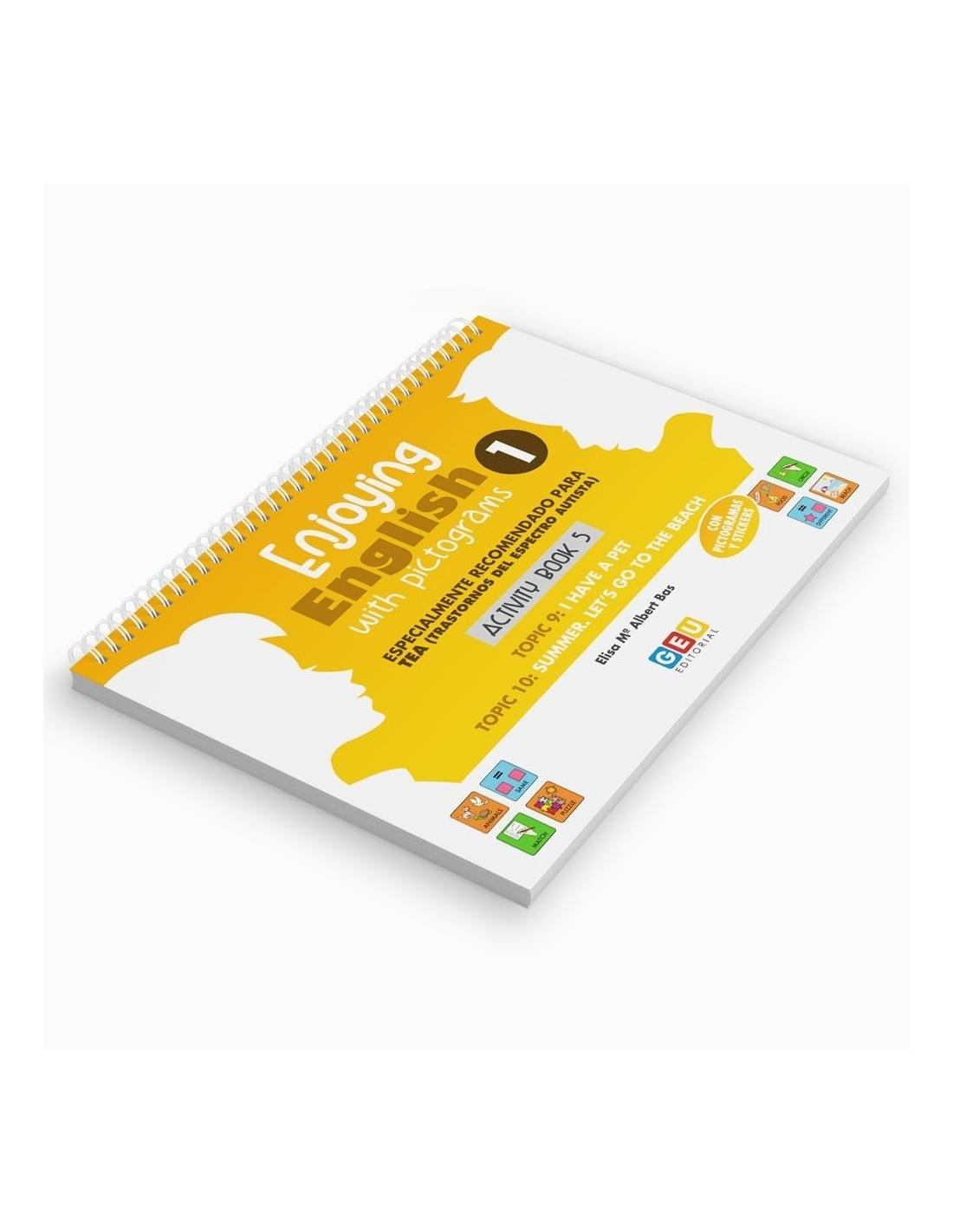 Enjoying English with pictograms 1. Activity book 5 es el quinto cuaderno de ejercicios de la colección ideada para aprender inglés en 1º de Educación Primaria. Se trata de un material con pictogramas y pegatinas recomendado especialmente para alumnos y alumnas diagnosticados de Trastorno del Espectro Autista (TEA).