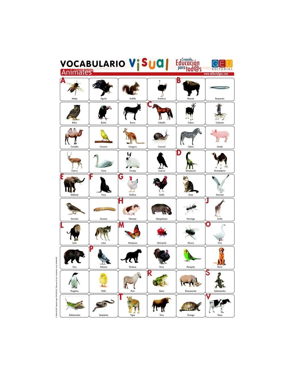 En esta lámina, de tamaño más reducido, podemos encontrar 60 de los animales más representativos, también ordenados alfabéticamente y representados en este caso por textos y fotografías.