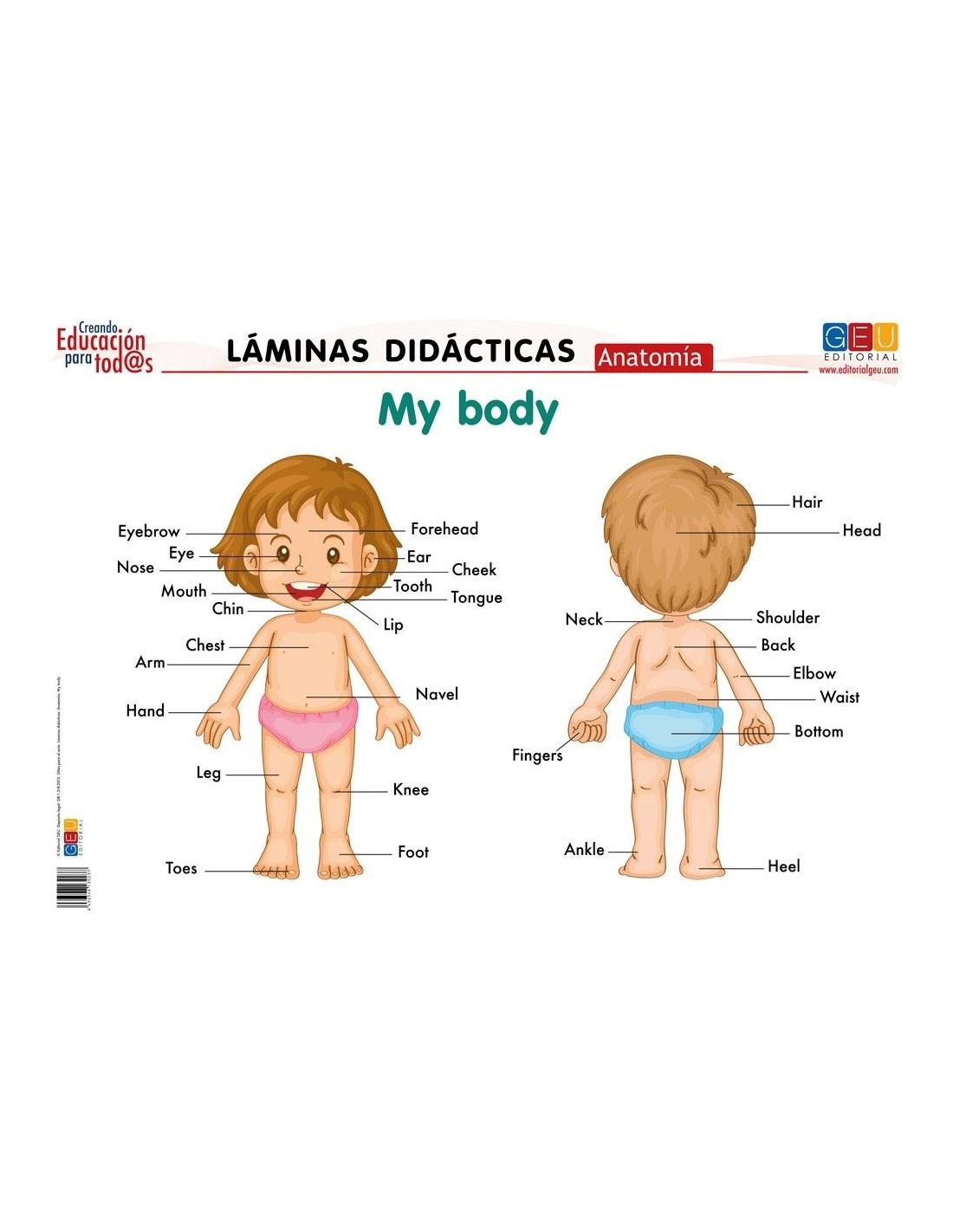 Láminas didácticas: Anatomía: My body, 1 lámina en alta calidad para aprender las partes del cuerpo en inglés. Recomendado para Educación Infantil y TEA.
