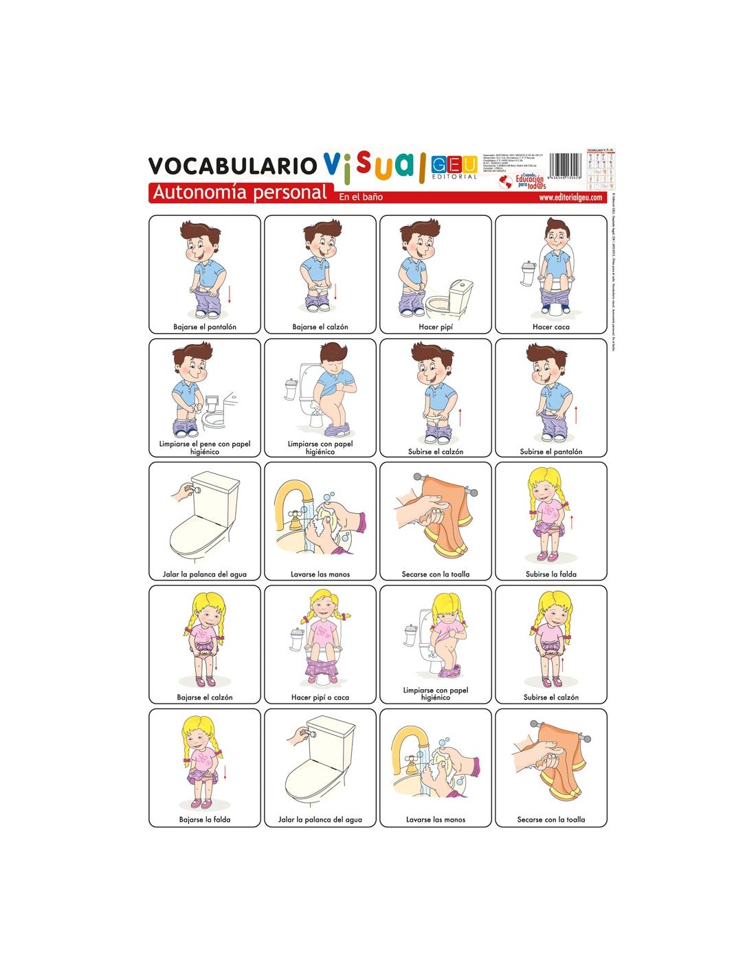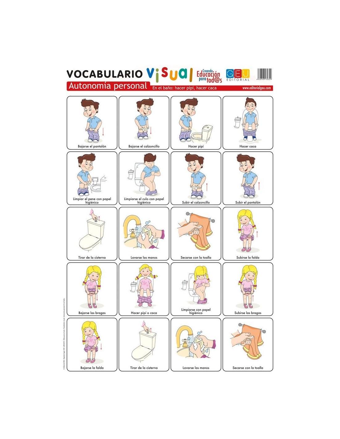 Láminas de vocabulario visual: Autonomía personal: En el baño: hacer pipí y hacer caca, 1 lámina en alta calidad para aprender paso a paso el procedimiento a seguir para hacer pipí y caca.