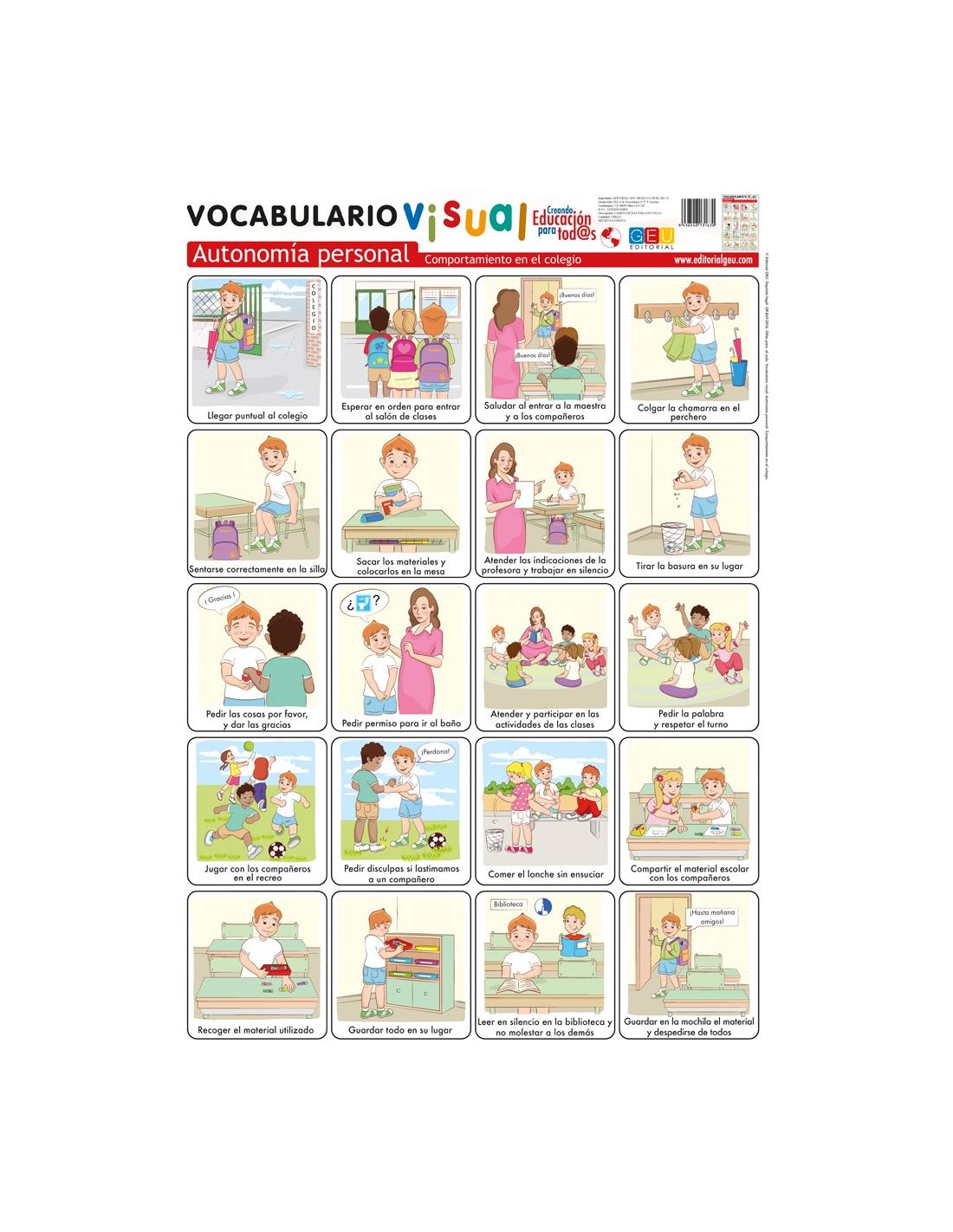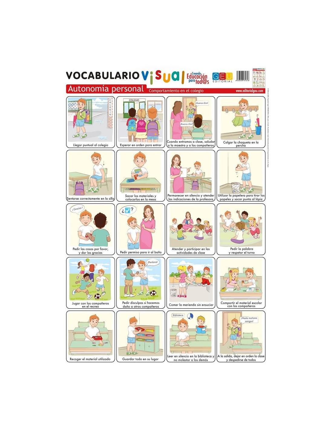 Láminas de vocabulario visual: Autonomía personal: comportamiento en el colegio. Una lámina en alta calidad para aprender paso a paso como comportarse en el colegio de forma correcta.
