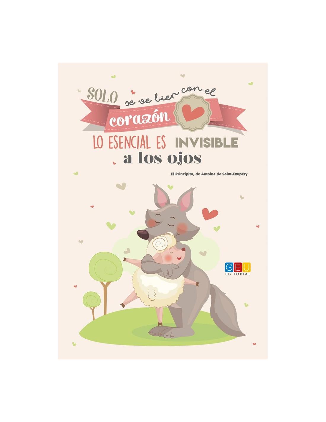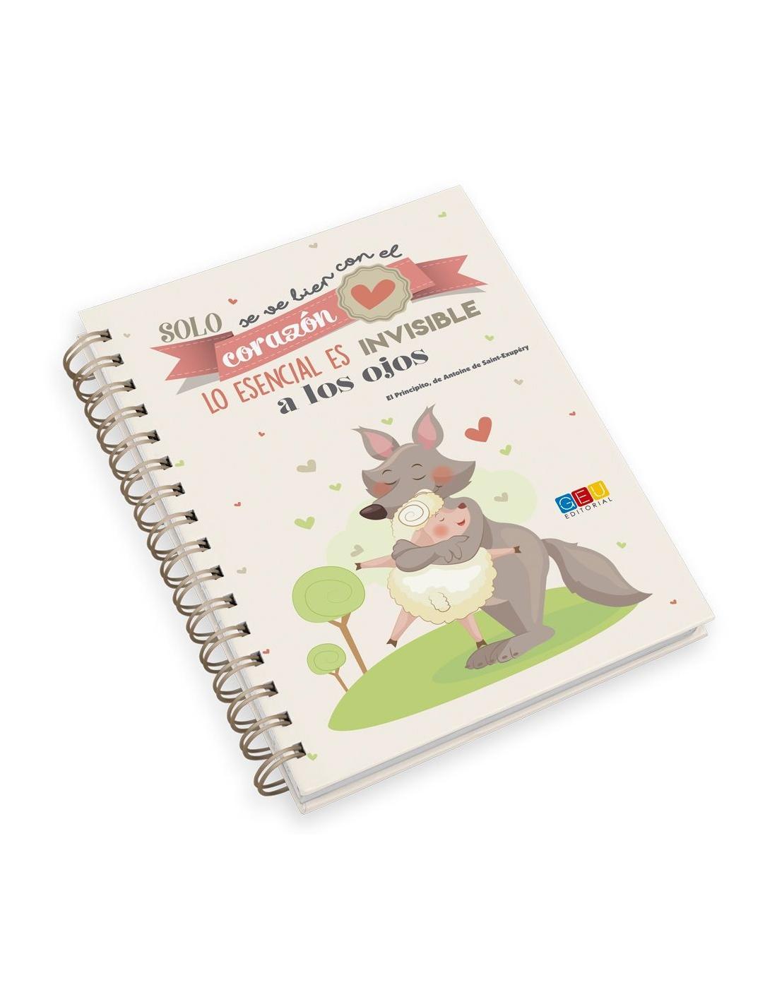 Libreta de tapa dura en formato A4 con la famosa frase de El principito “Solo se ve bien con el corazón”. La ilustración de la libreta tiene como protagonistas a un lobo y un corderito abrazados simbolizando que aunque existan grandes diferencias entre nosotros podemos llevarnos bien.