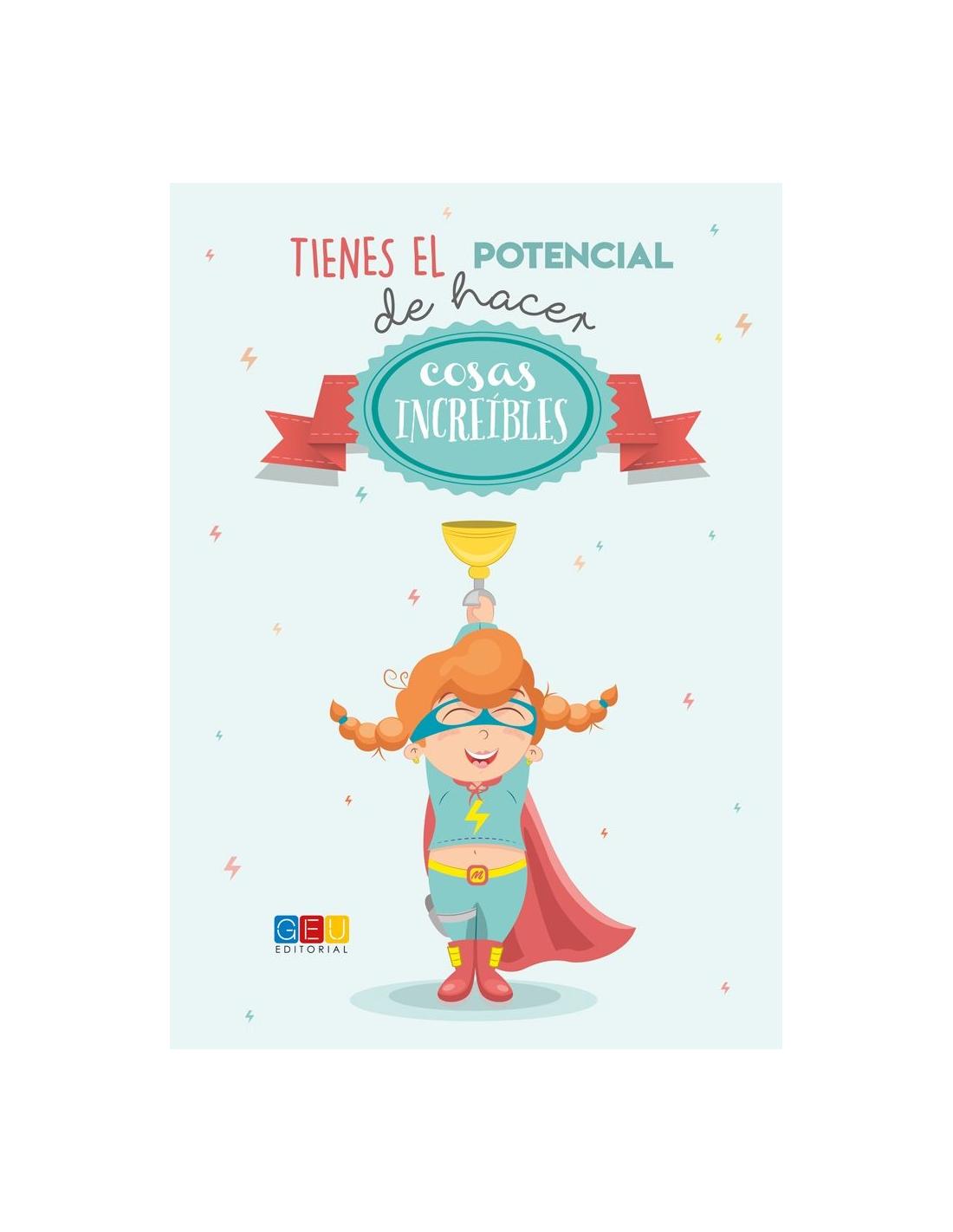 Libreta de tapa dura en formato A4 con la frase “Tienes el potencial de hacer cosas increíbles". La ilustración de la libreta tiene como protagonista a una pequeña superheroína.