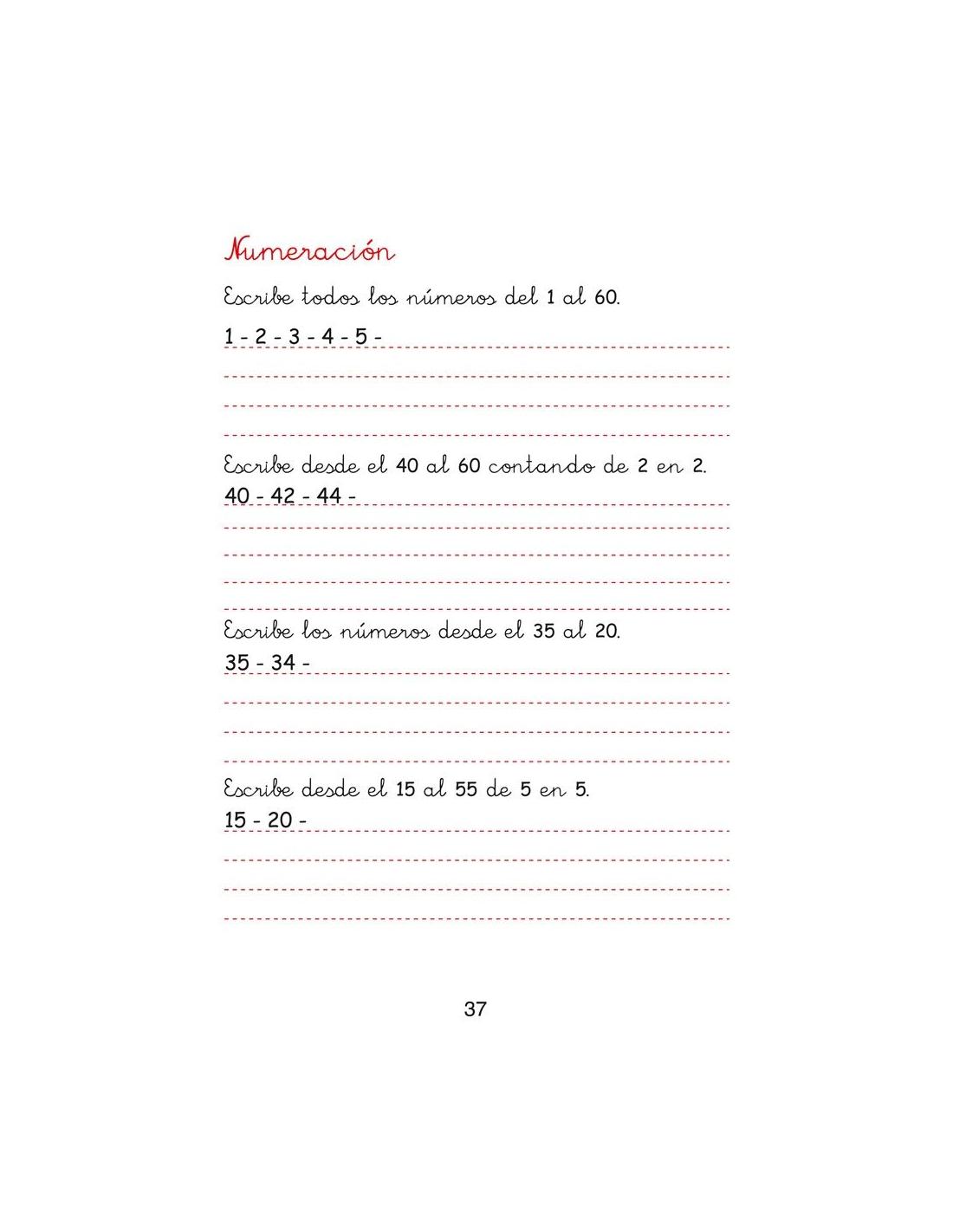 - Numeración: hasta el número 60, iniciación en el concepto de decena.