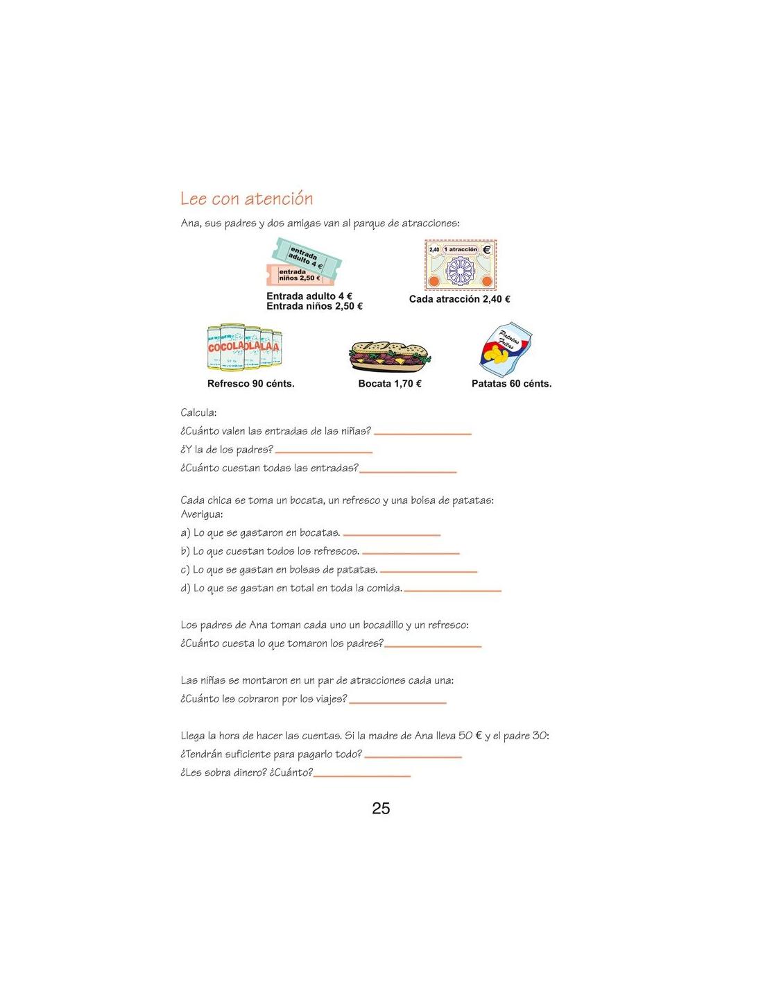 - Cálculo: multiplicación por 2 y 3 cifras, por la unidad seguida de ceros, con ceros intermedios, división exacta e inexacta, por 2 y 3 cifras en el divisor, doble-triple, mitad-tercio, etc.