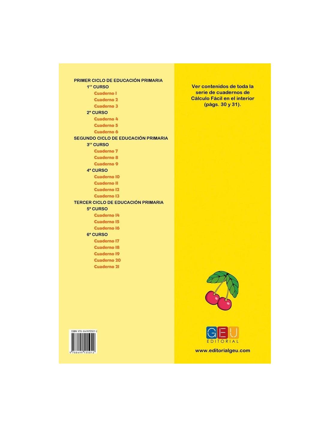 Cálculo fácil 16 forma parte de una colección compuesta por 21 cuadernos que abarca todos los contenidos operativos de cálculo en Primaria de una manera fácil, sencilla e intuitiva.