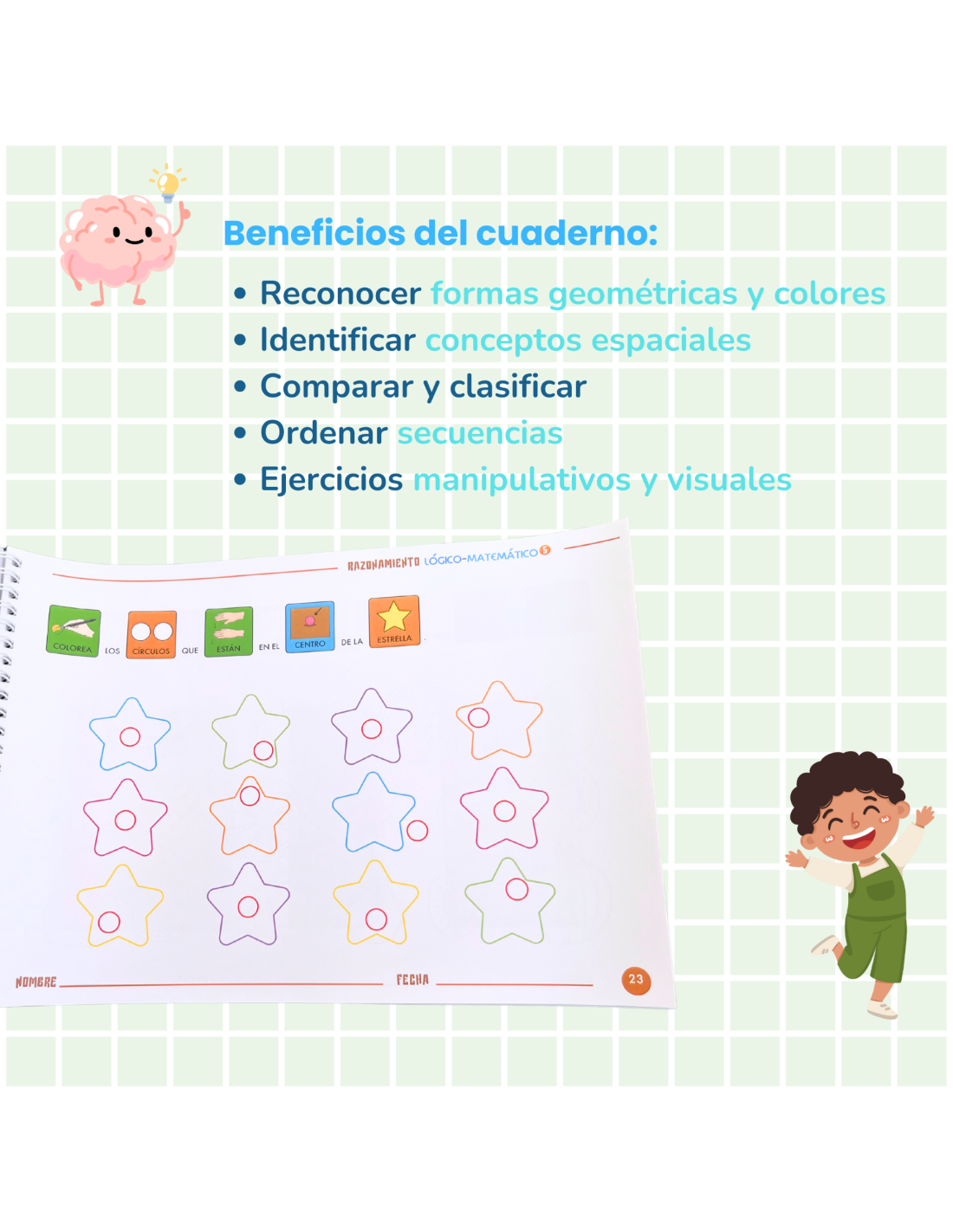 Este quinto cuaderno cierra la colección de Razonamiento Lógico-Matemático de Editorial GEU, con actividades pensadas para consolidar lo aprendido y dar un paso más en el desarrollo cognitivo de los peques. Ideal para niños de Educación Infantil y para alumnado con necesidades educativas especiales, ofrece propuestas claras, visuales y adaptadas a su ritmo.