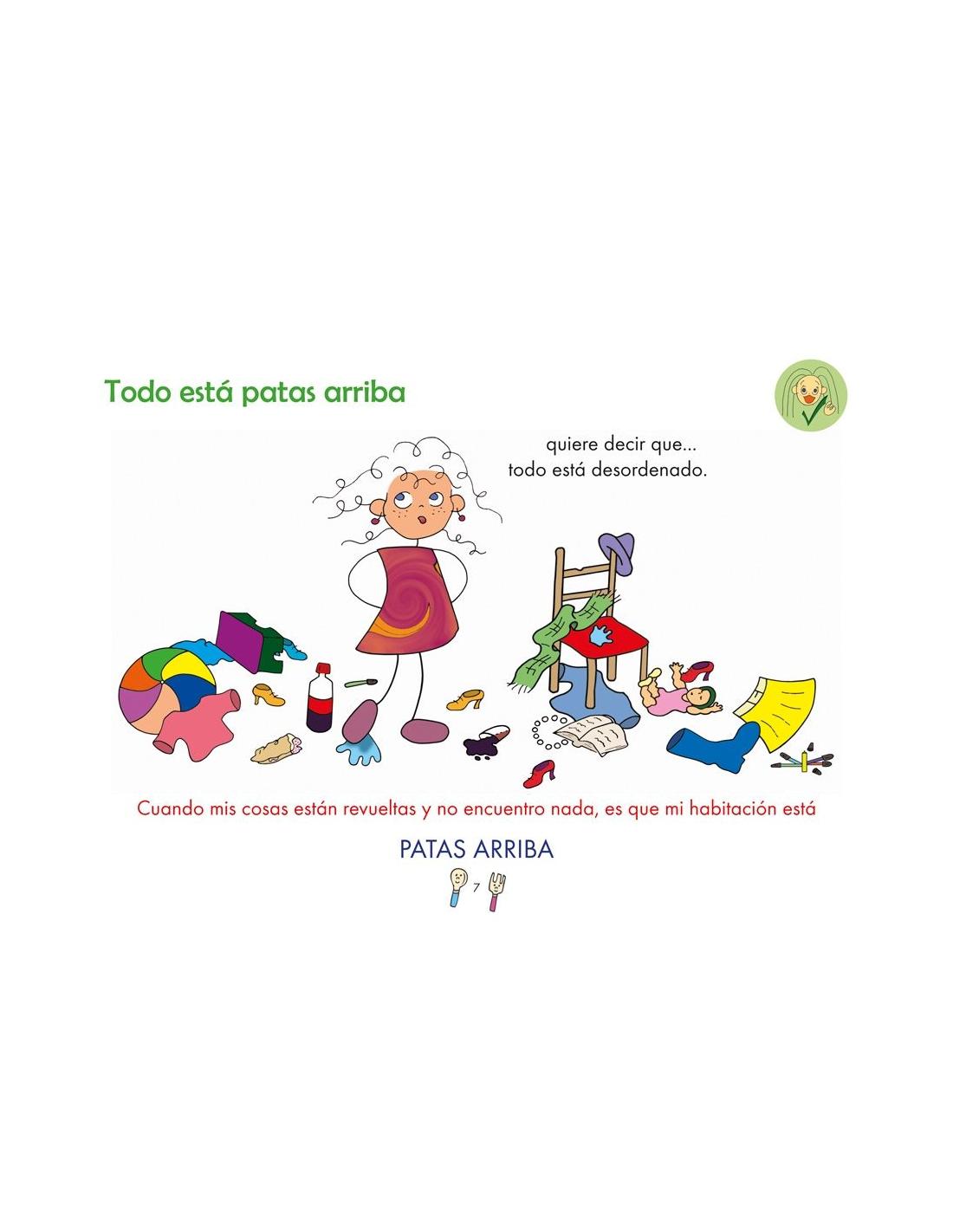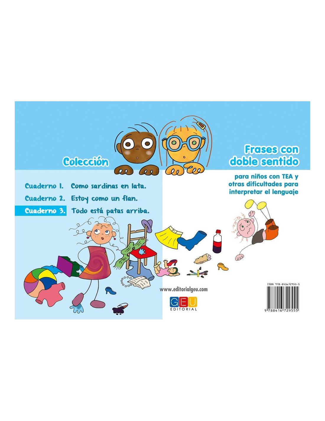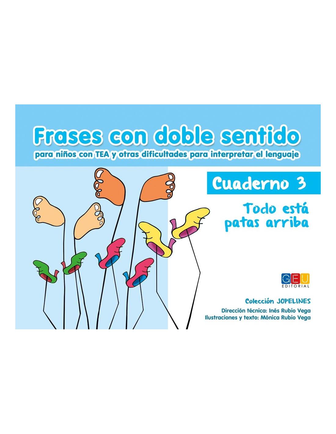 Frases con doble sentido. Cuaderno 3 Todo está patas arriba incluye 47 páginas presentadas en un cuaderno horizontal con anillas. El material se divide en: la explicación de lo que quiere decir la frase que se trabaja (“Todo está patas arriba quiere decir que todo está desordenado”); la explicación de lo que no quiere decir la frase (“No es que me haya dado la vuelta y se me queden las piernas arriba”); y, por último, un ejemplo en tono humorístico para acabar de comprender cuál es y cuál no el significado de cada una de las frases.